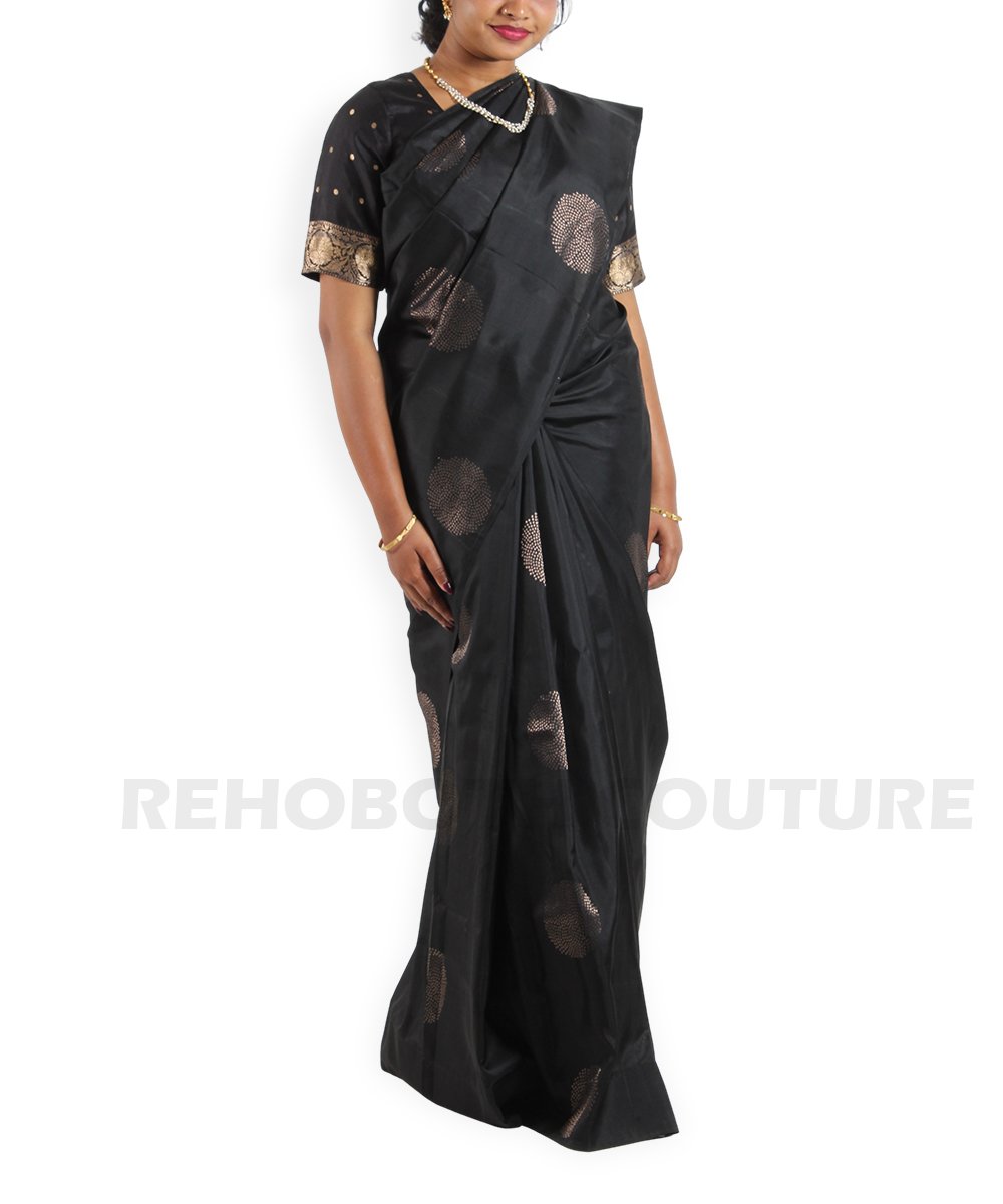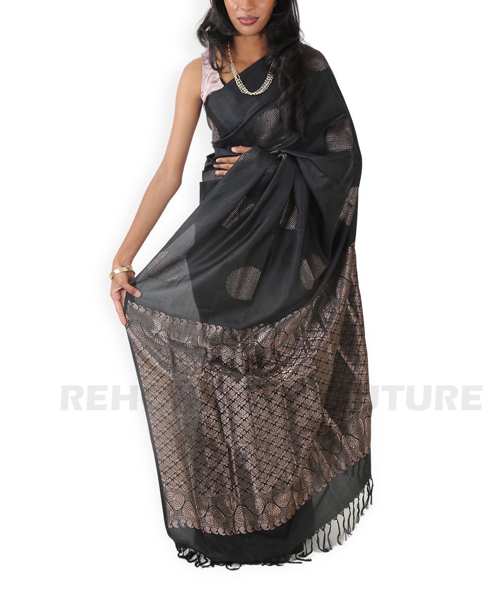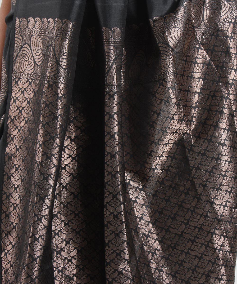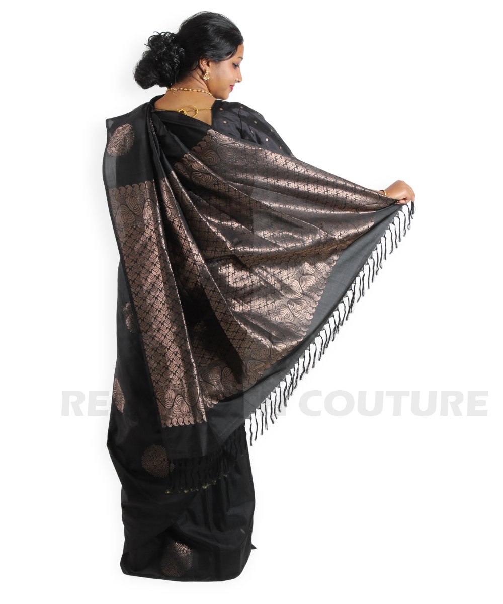 Black pure silk with copper motifs and ornate border.