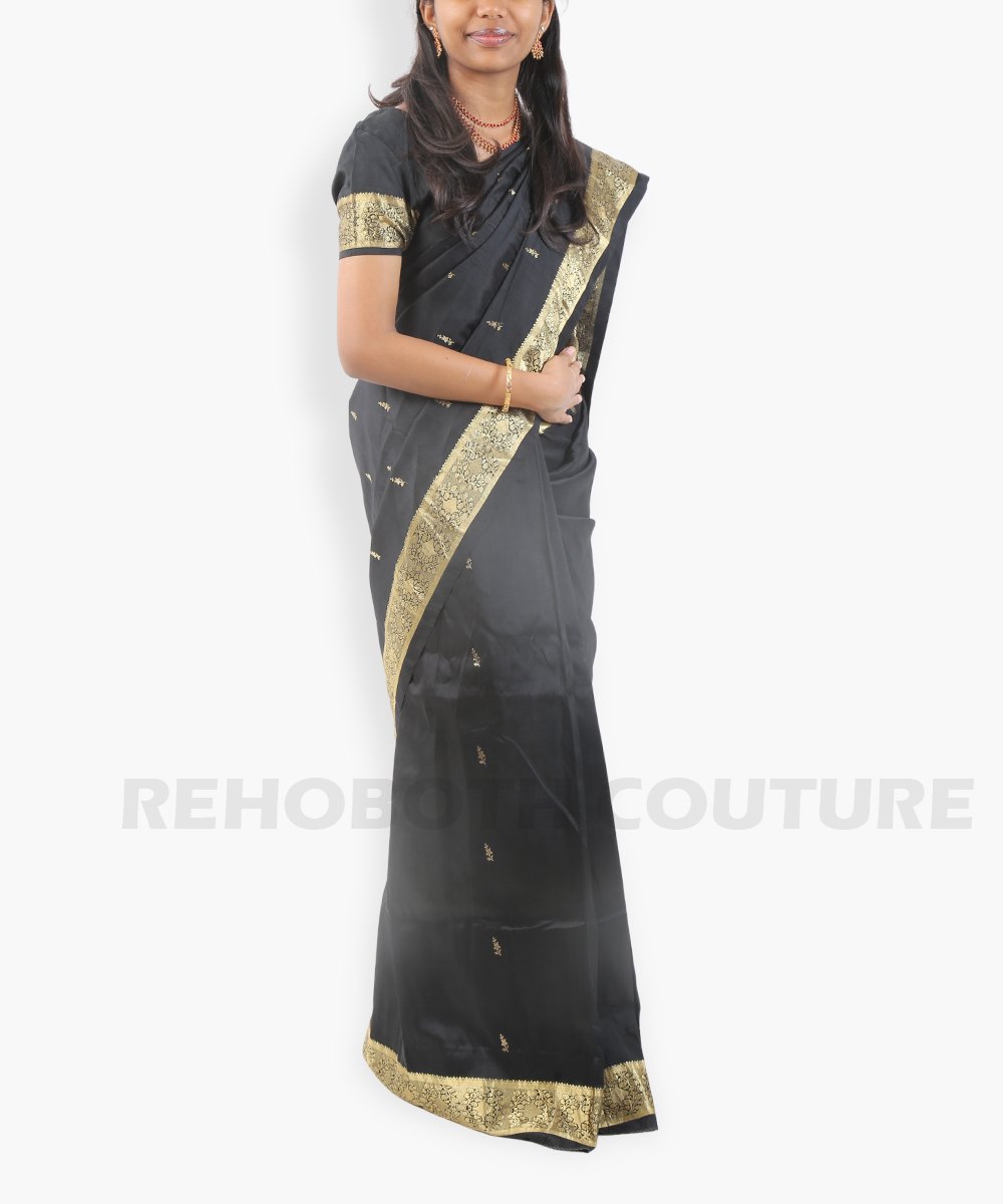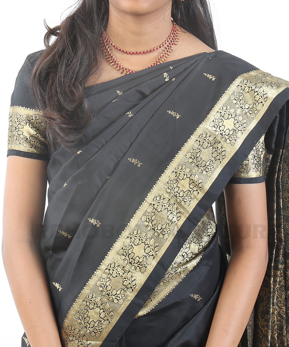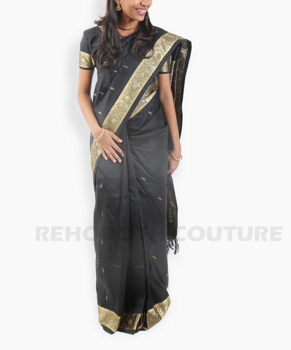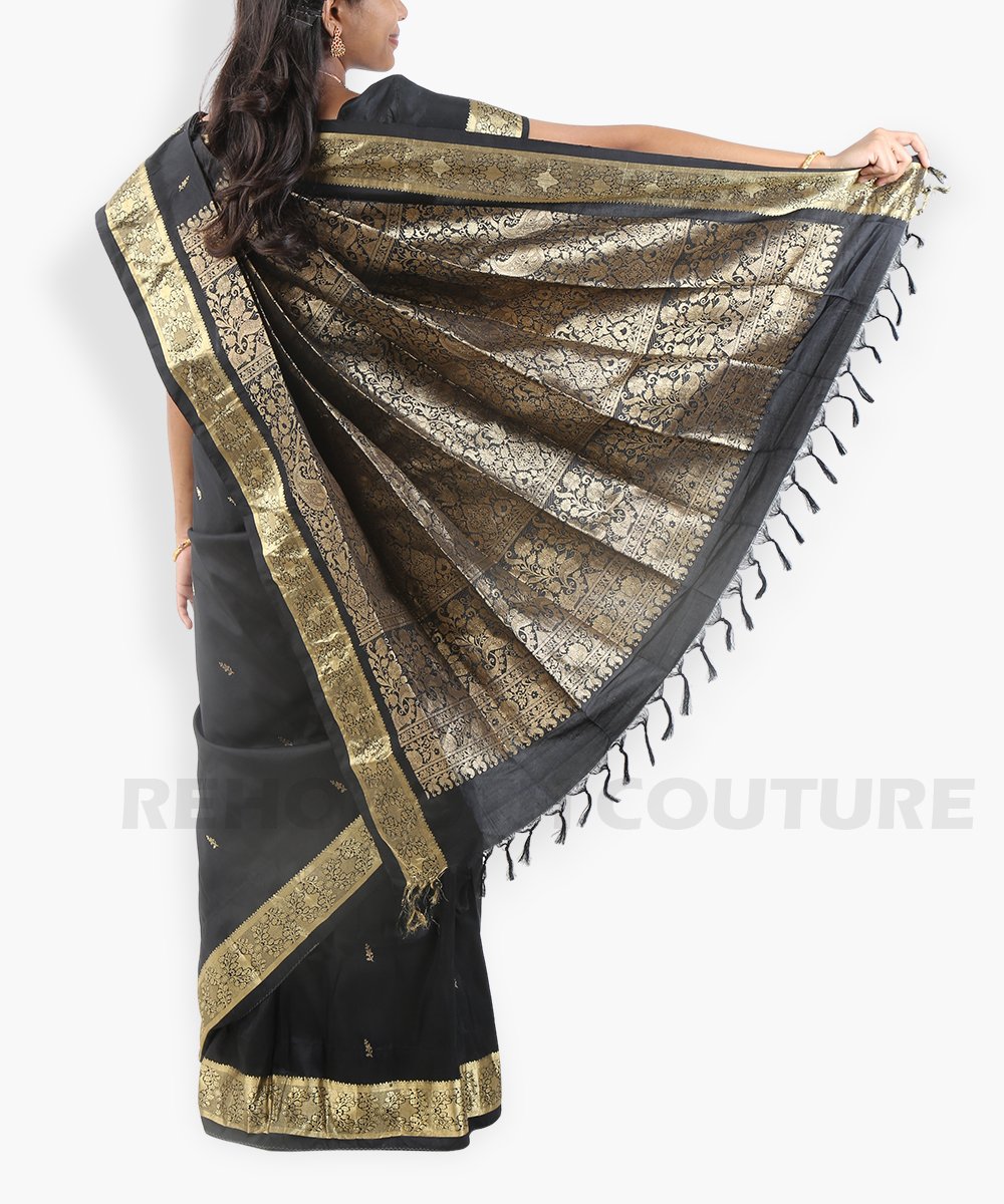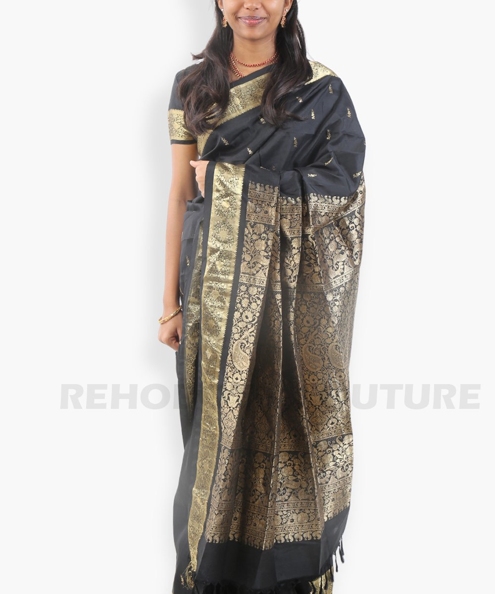 Rent this black Kanchivaram silk saree with golden zari border, available on rent and return basis. Elaborate brocade work with floral paisley patterns on border and rich pallu exude grandeur.
