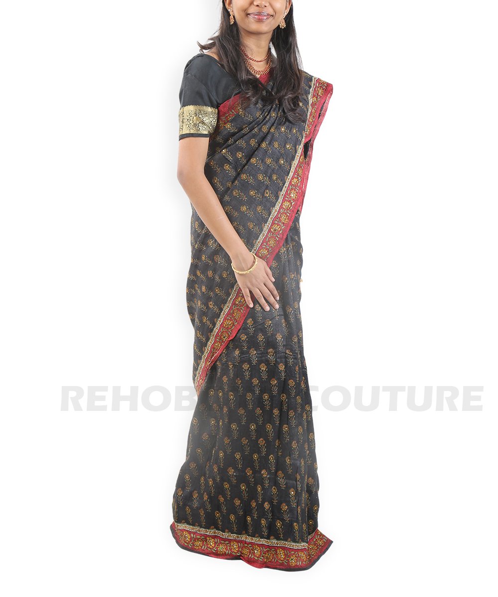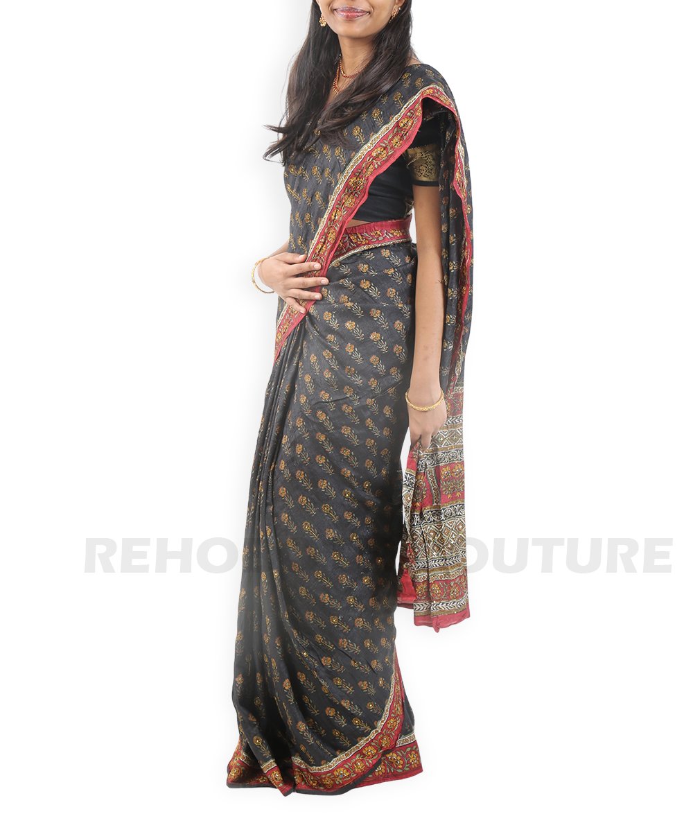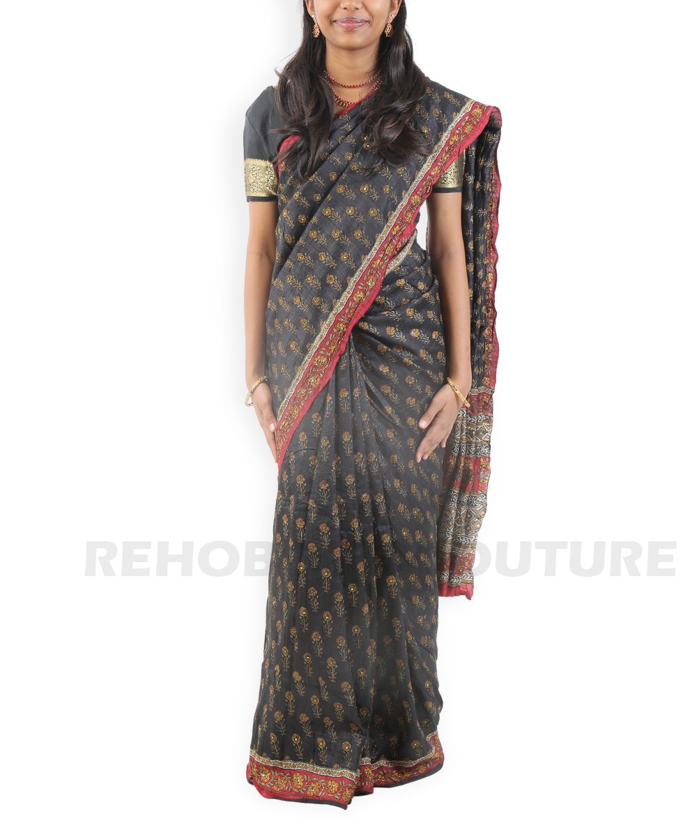 Rent this elegant black handloom cotton silk or mulmul saree, available on rent and return basis. Featuring intricate floral motifs across the saree using Jamdani technique and contrasting red and gold border, it offers timeless sophistication. Perfect for weddings and cultural events.