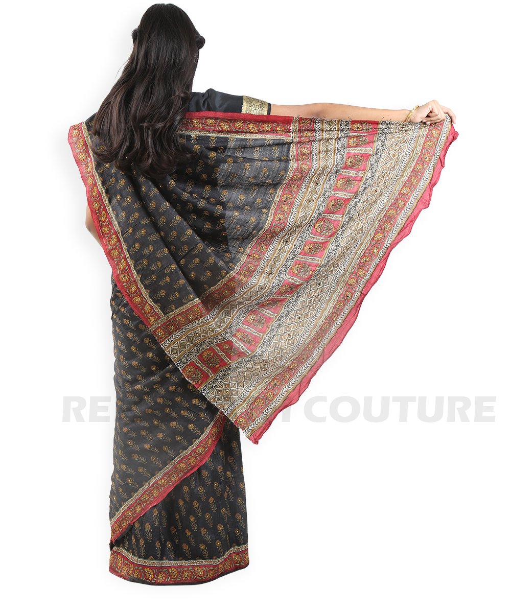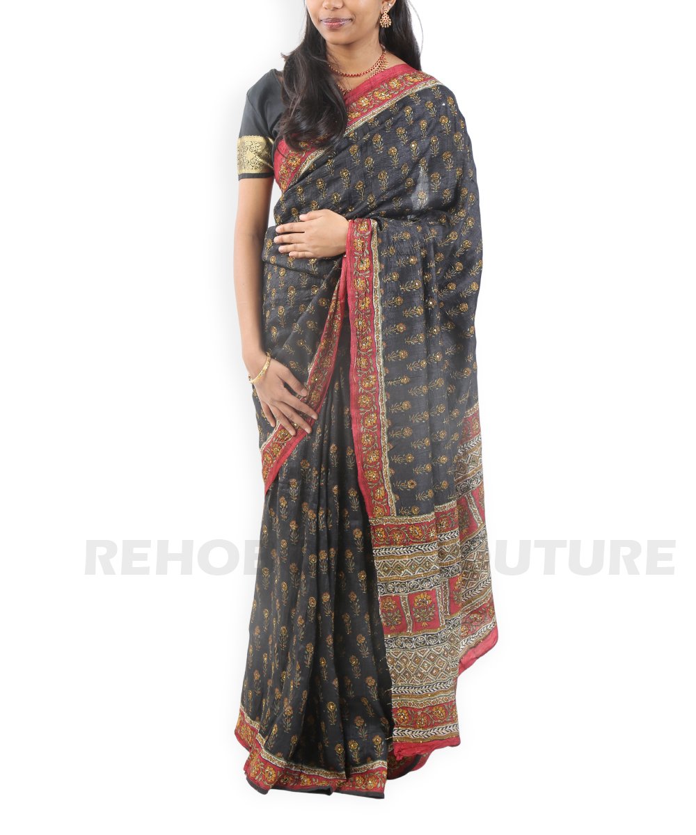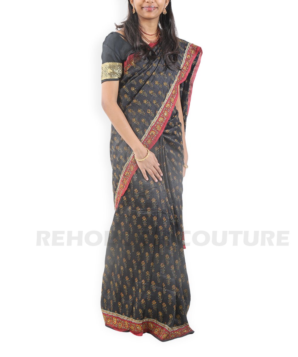 Rent this elegant black handloom cotton silk or mulmul saree, available on rent and return basis. Featuring intricate floral motifs across the saree using Jamdani technique and contrasting red and gold border, it offers timeless sophistication. Perfect for weddings and cultural events.