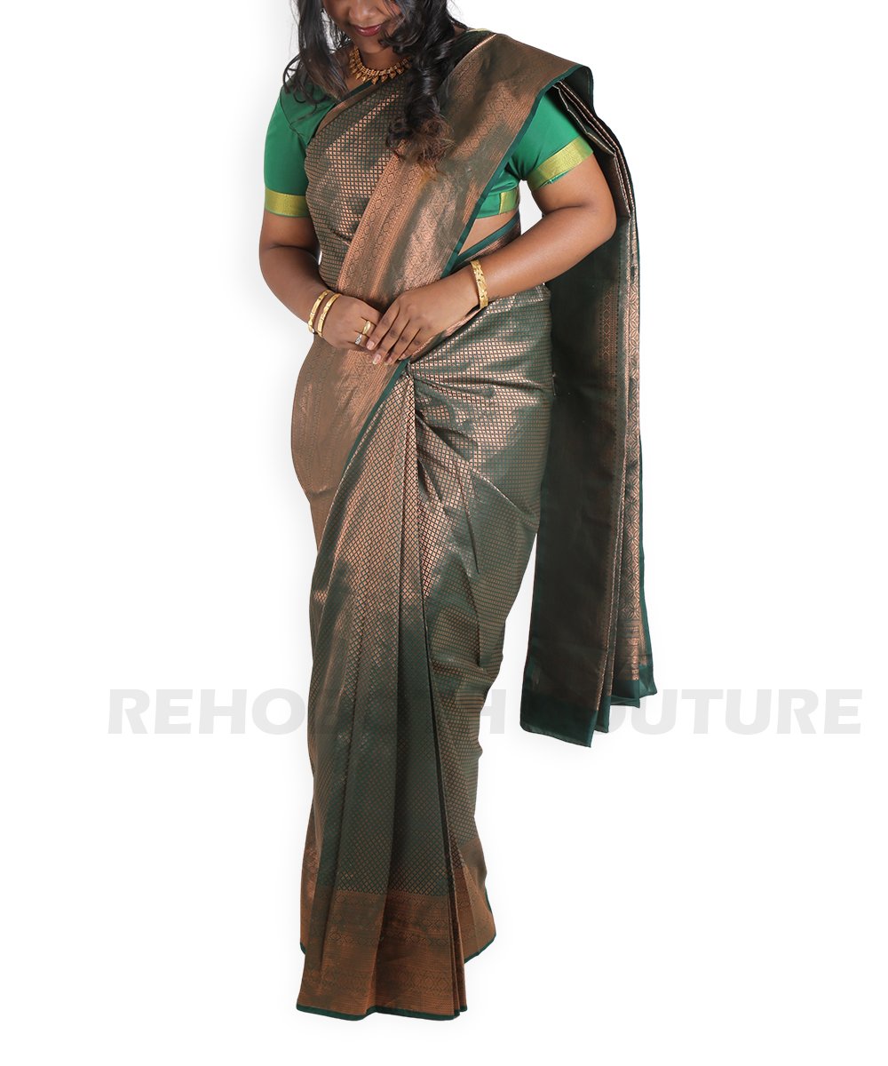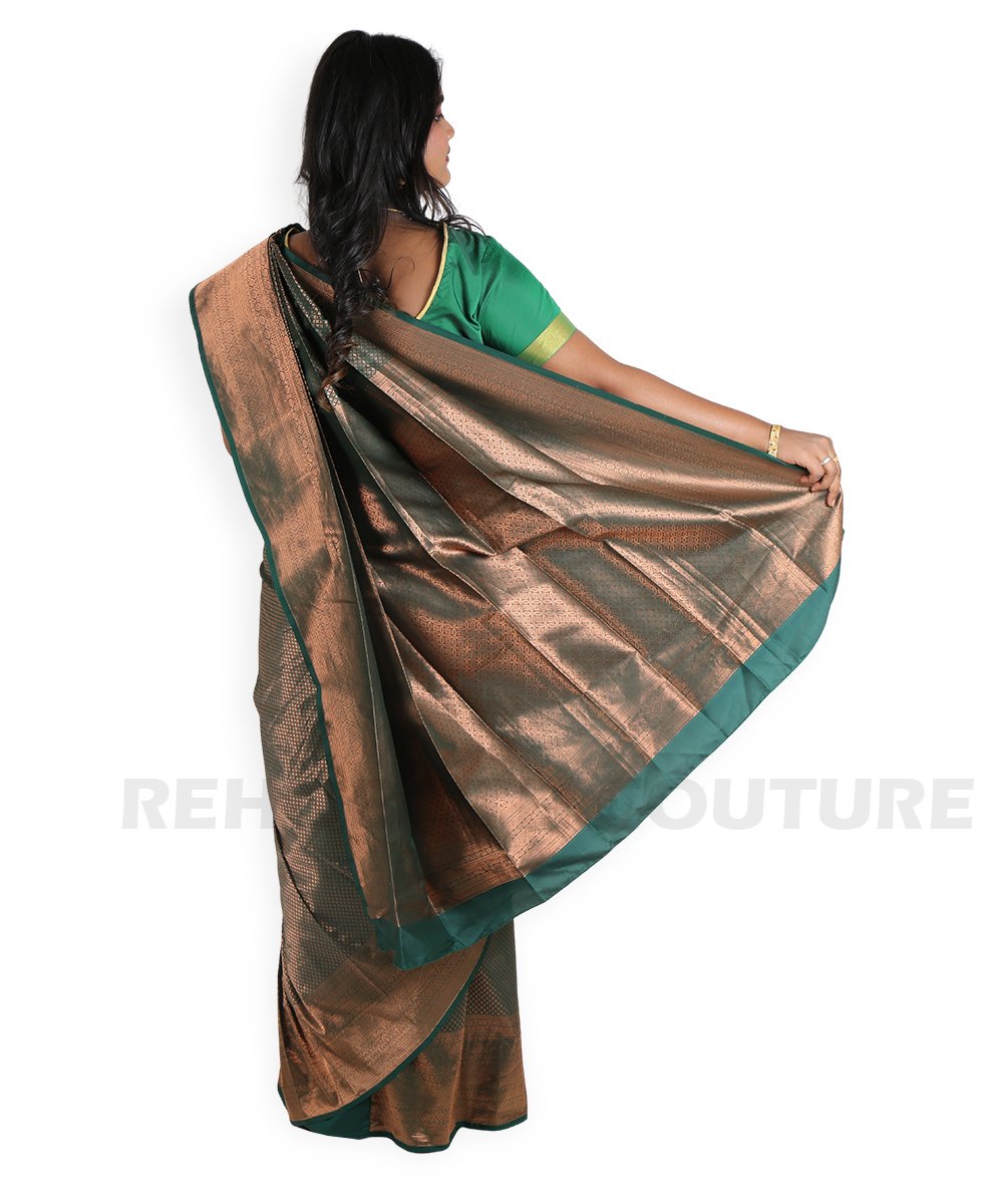 Bottle green pure Banarasi silk with copper motifs.