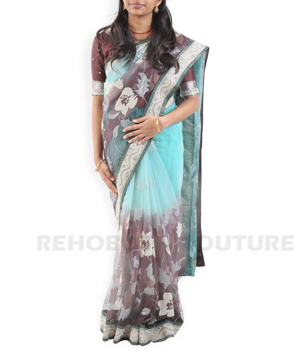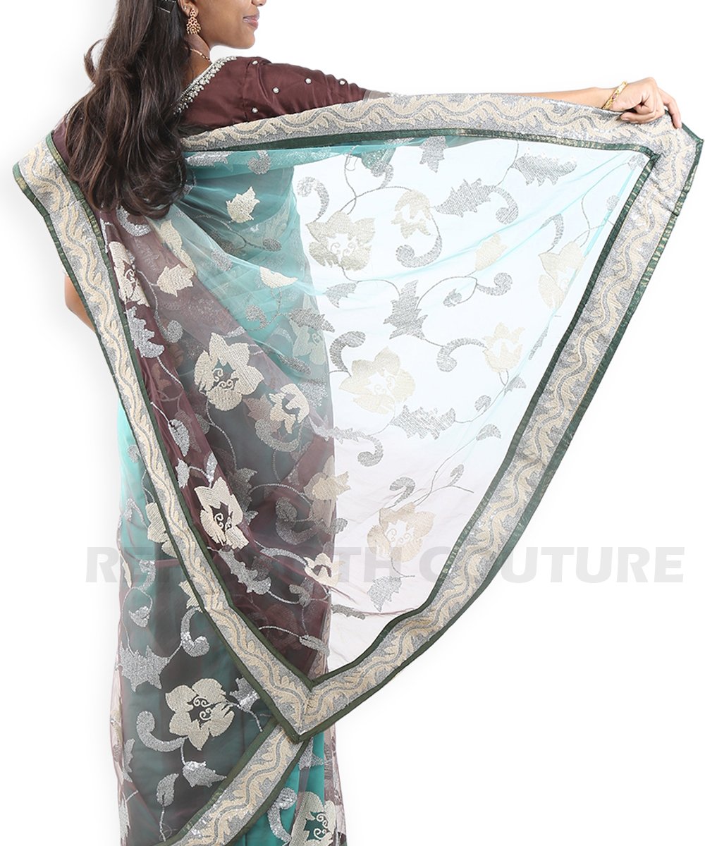 Rent this unique Brosso fabric saree with a silver or grey border, available on rent and return basis. Featuring self-woven geometric or floral leaf patterns, it provides a modern twist on traditional elegance. Great for contemporary occasions with its subtle sophistication.