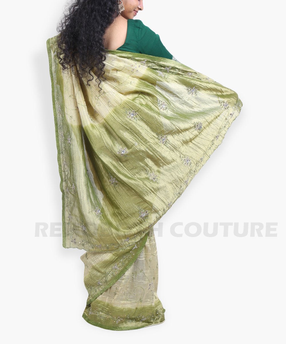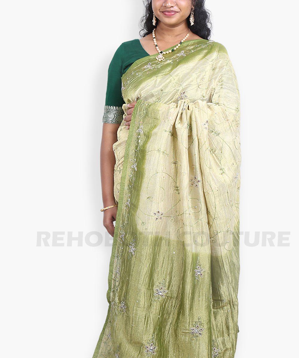 Rent this creamy crushed tissue saree with olive green pallu, available on rent and return basis. Small embroidered flowers throughout the body complement the pastel pallu shades, following popular trends. Lightweight and stylish for modern occasions.