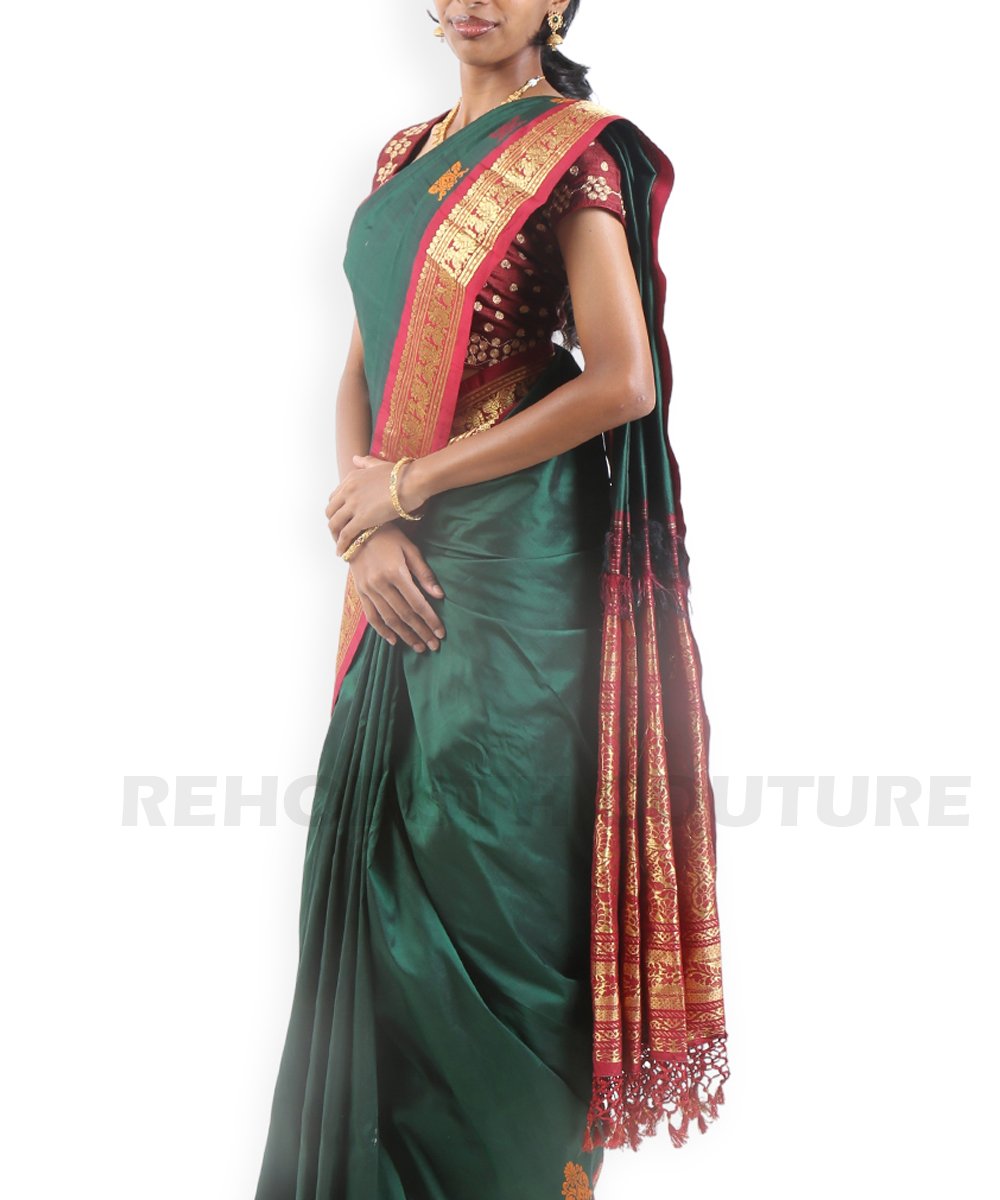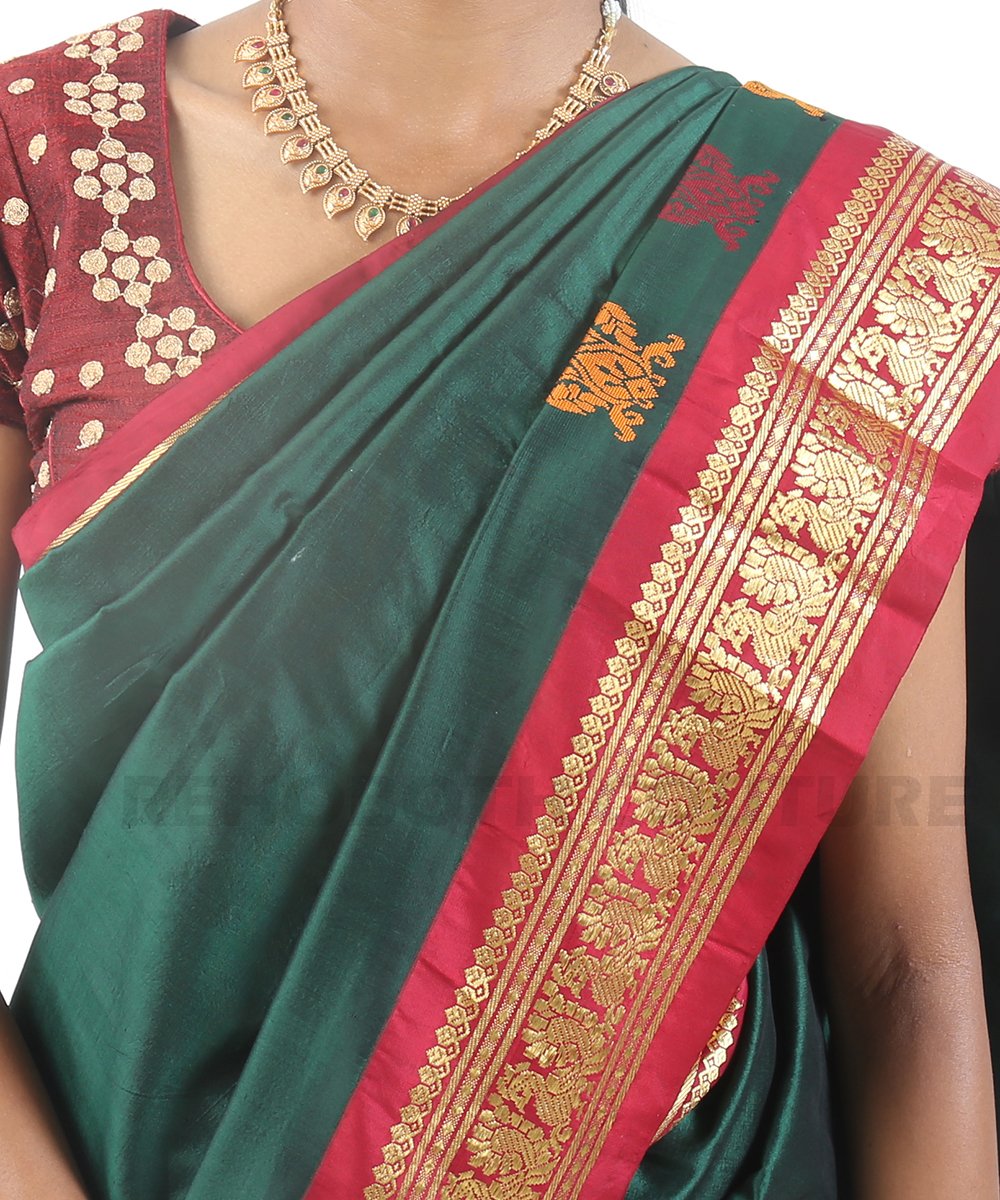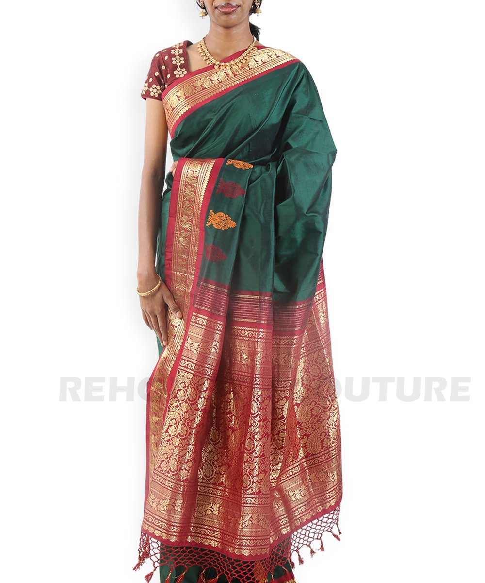 Rich emerald green pure silk with zari motifs.