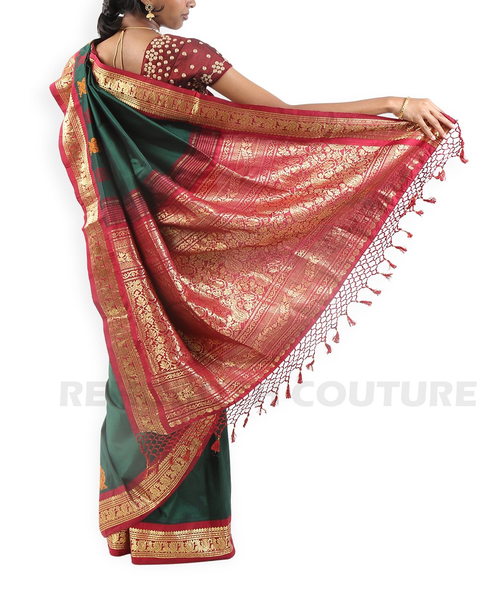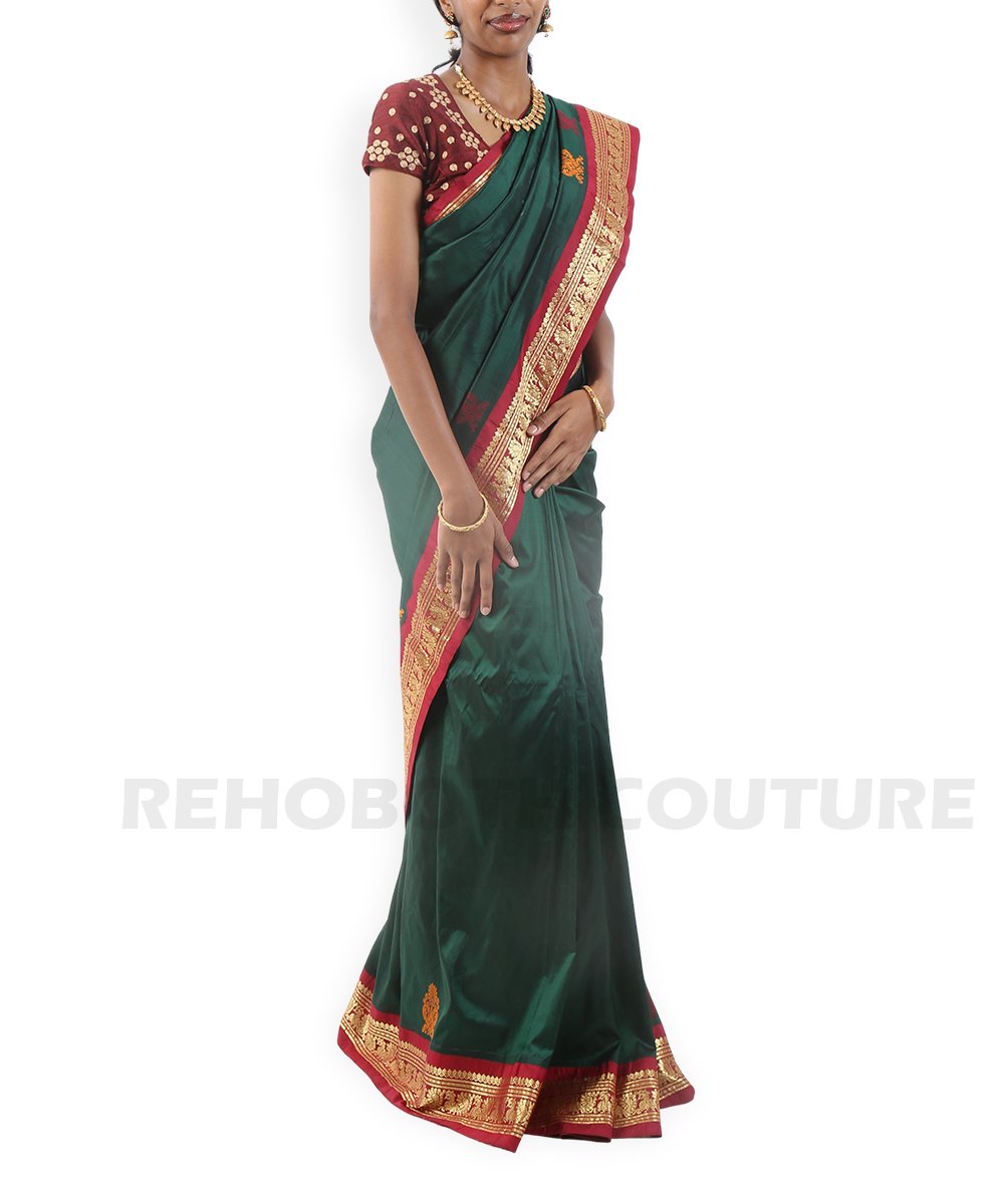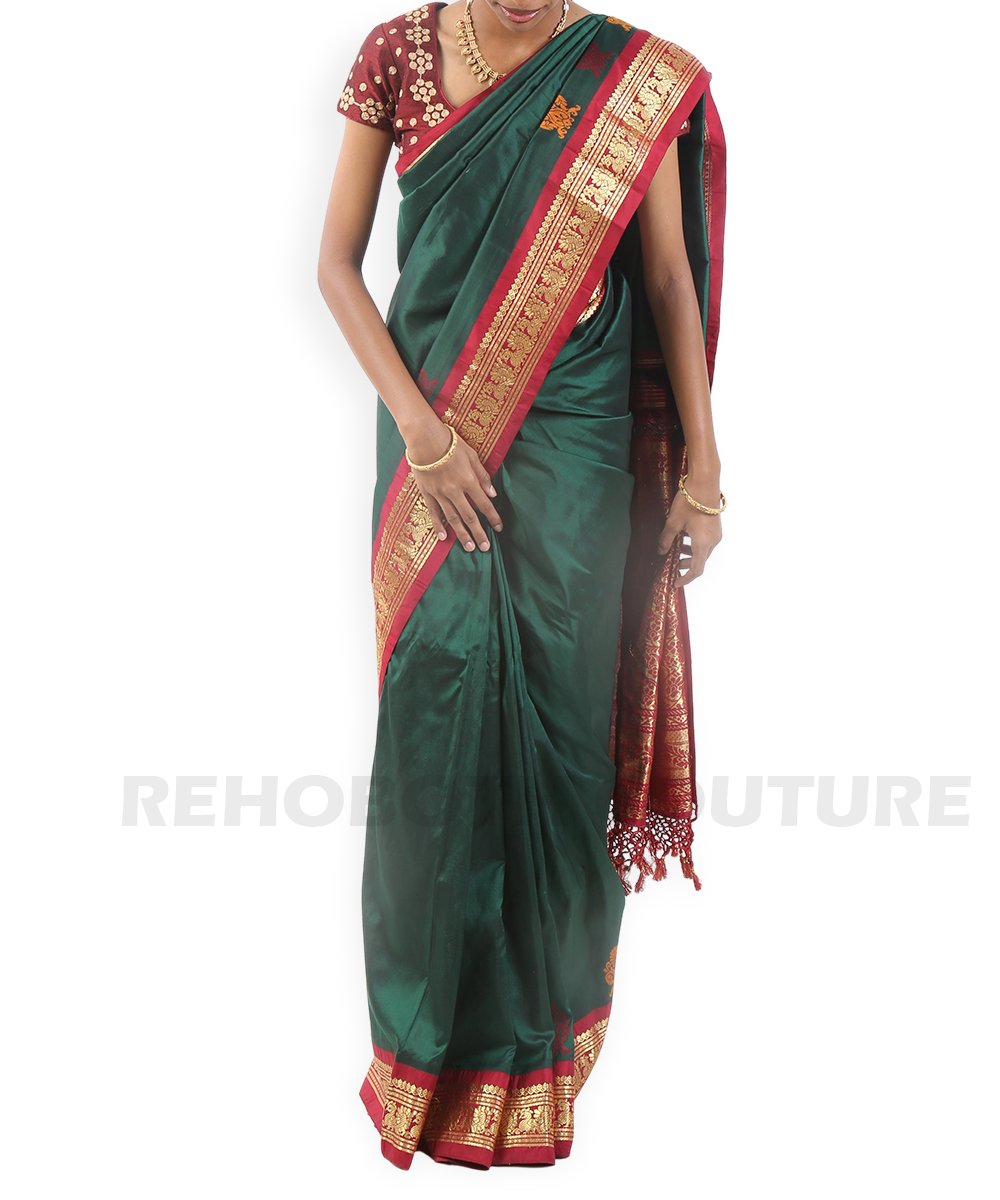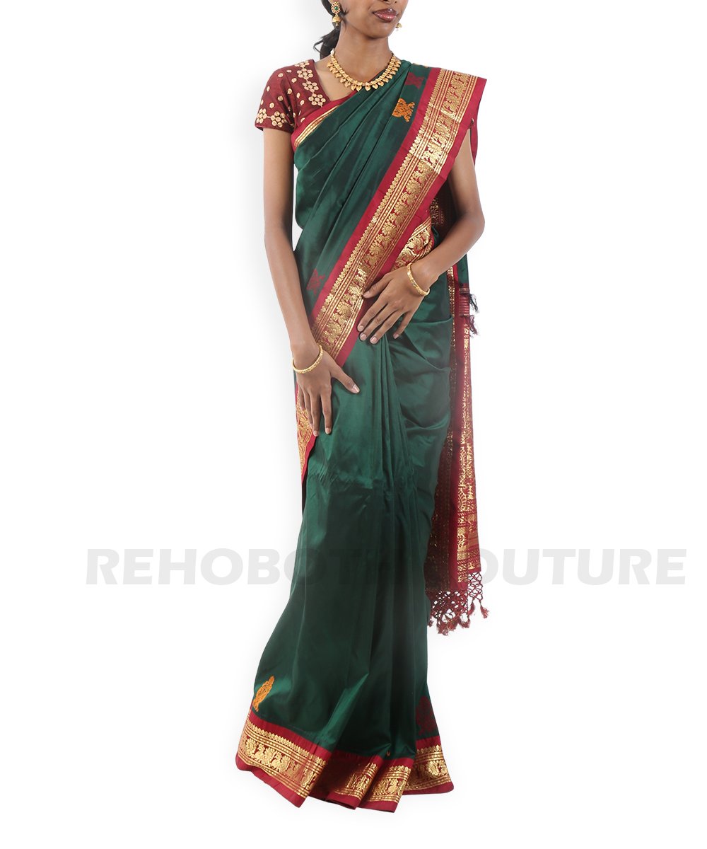 Rich emerald green pure silk with zari motifs.