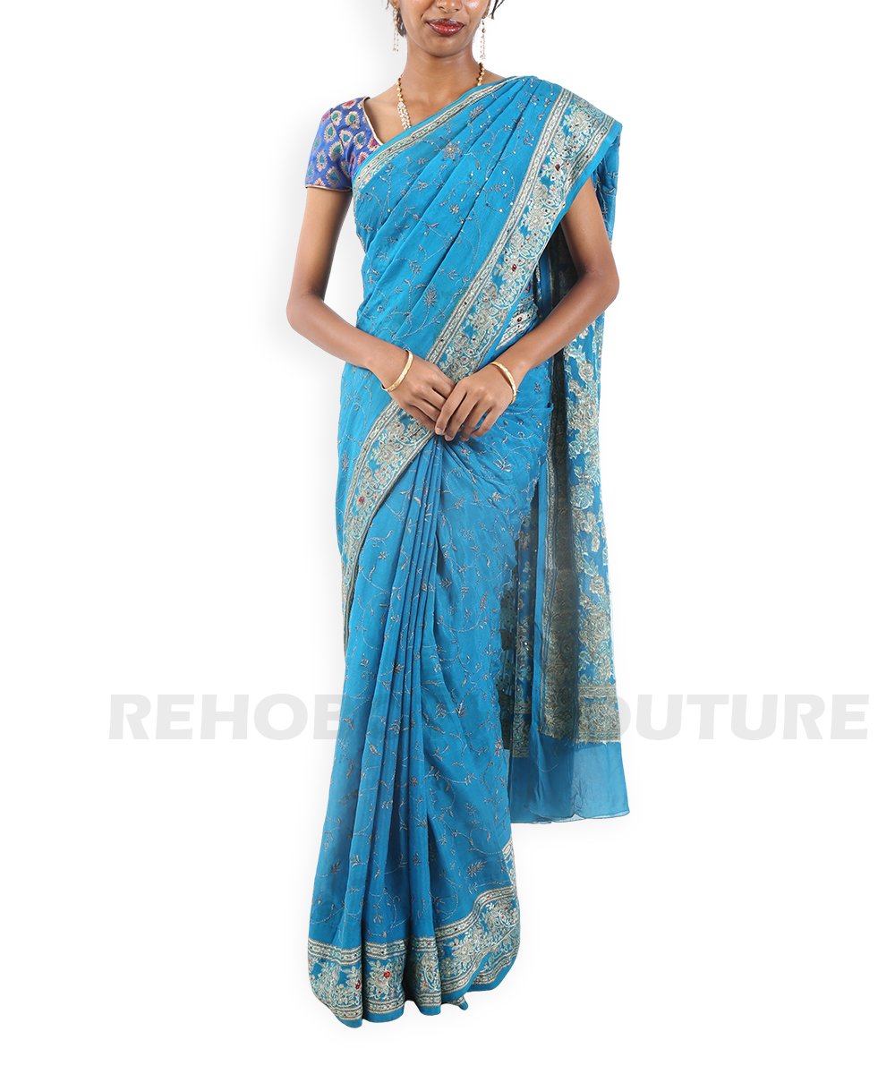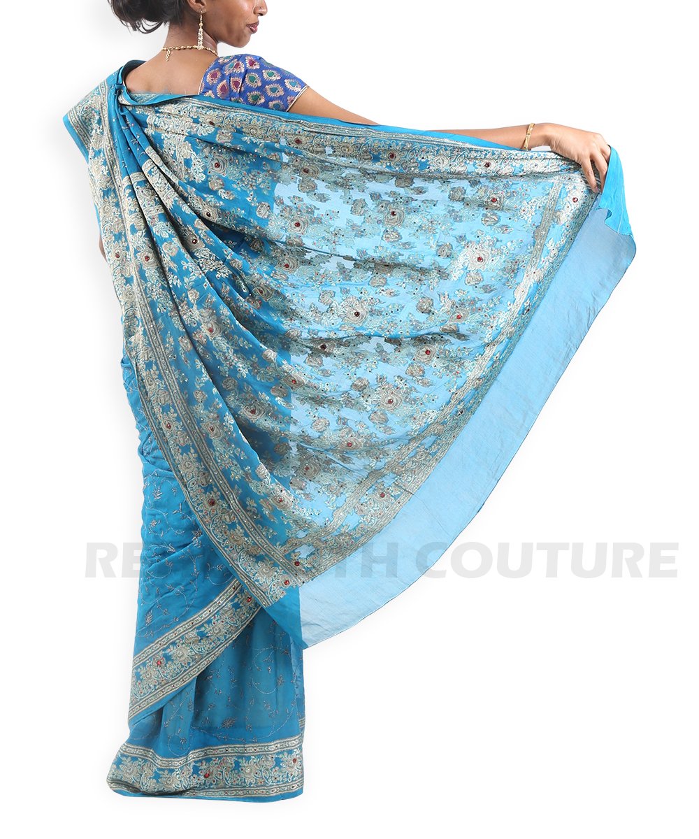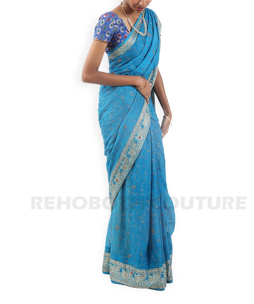 Blue georgette with digital prints and sequins.