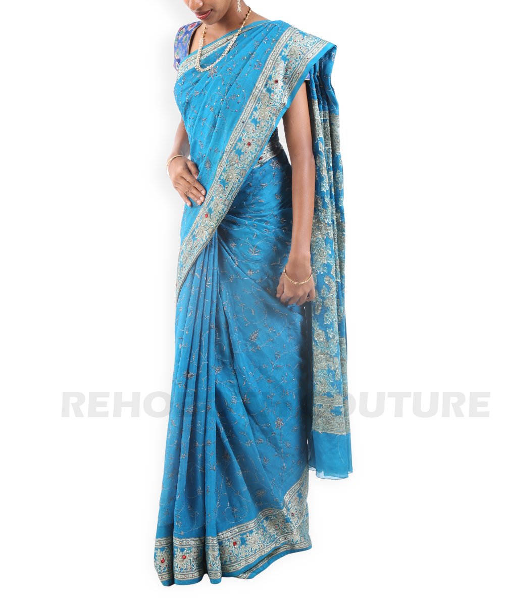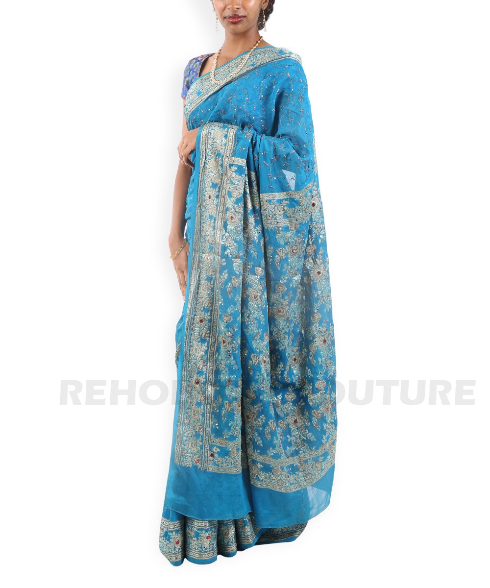 Rent this designer blue georgette saree with extensive digital prints, embroidery, and sequence work, available on rent and return basis. Sparkling border details make it ideal for party wear and festive functions.