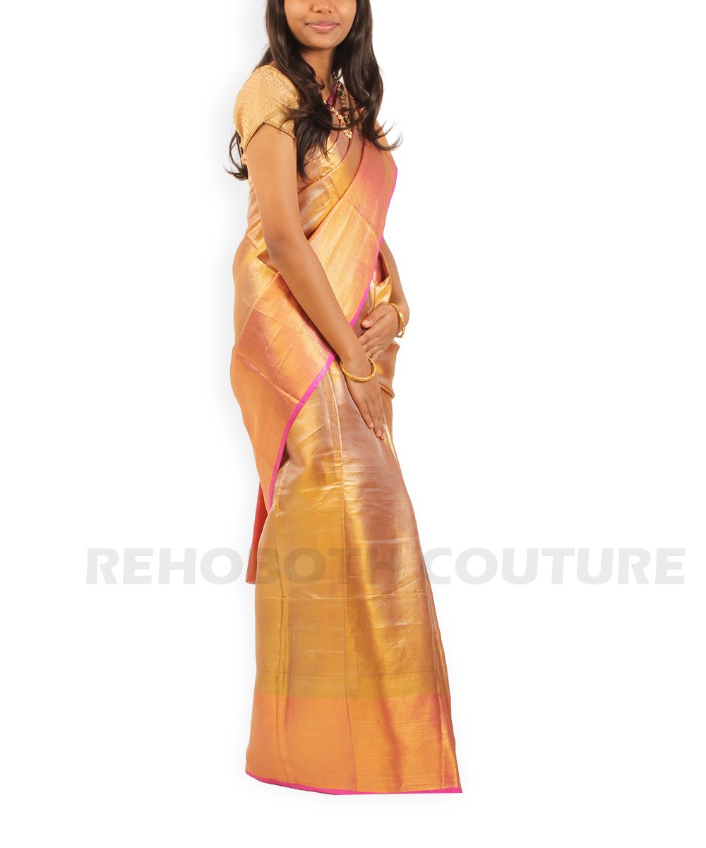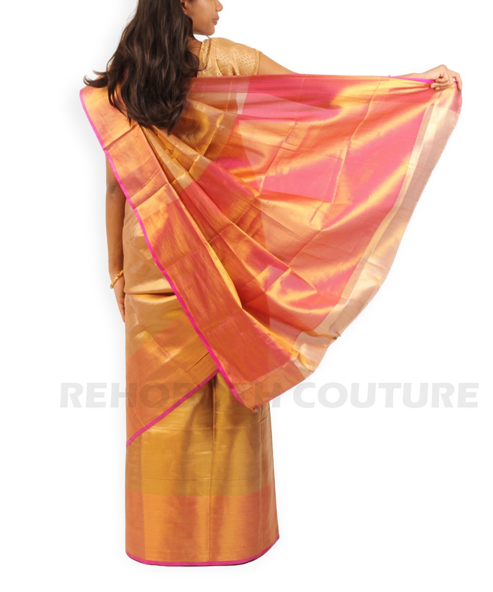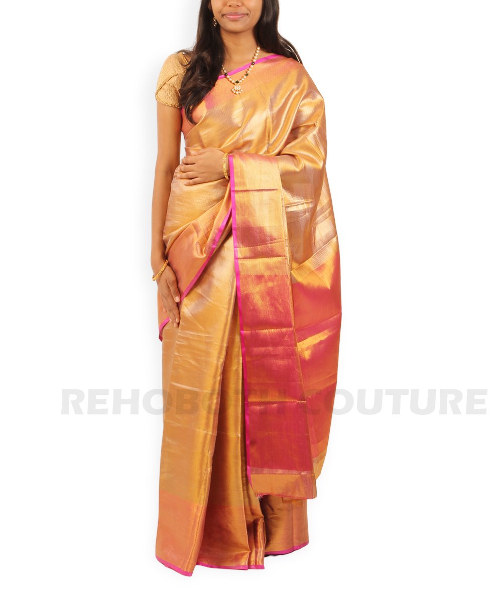 Rent this golden-hued and pink mixed tissue saree, available on rent and return basis. Delicate blend creates rich look with thin pink border for an elegant, lightweight party option.