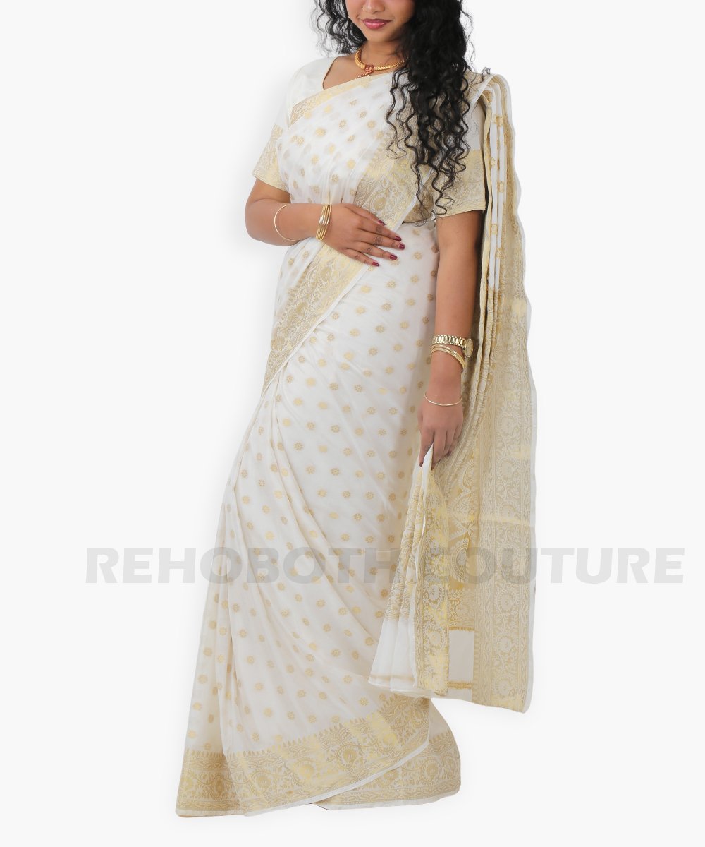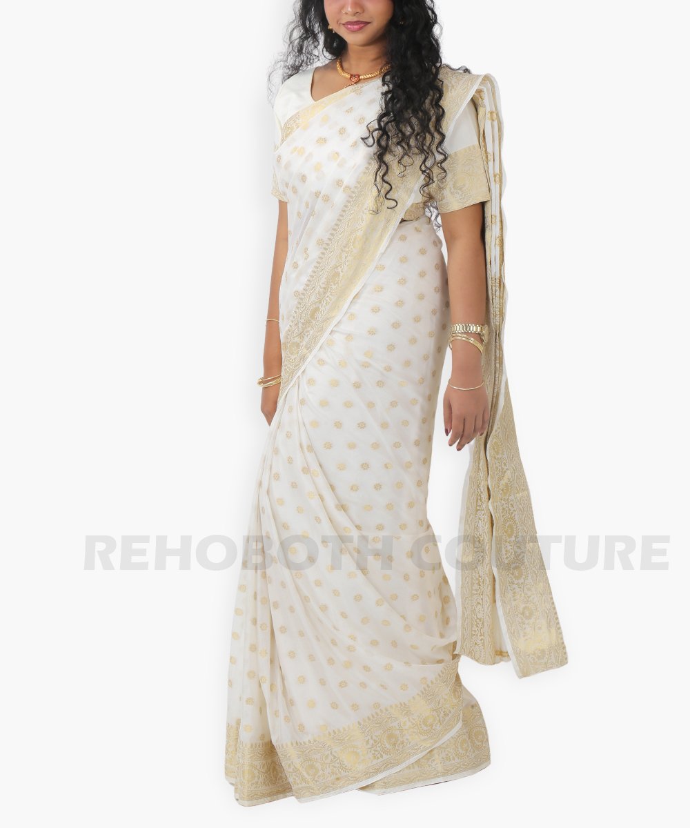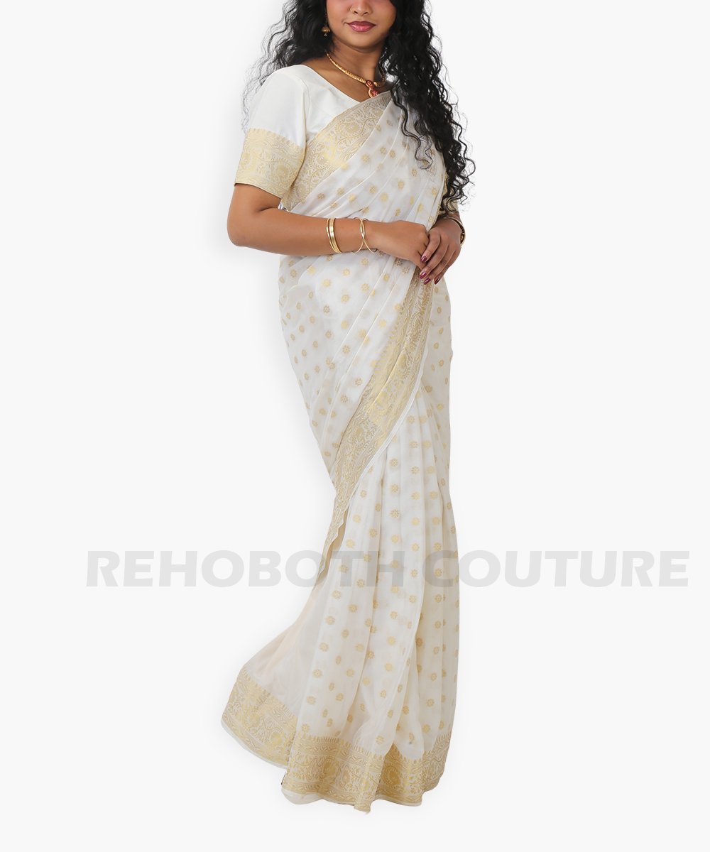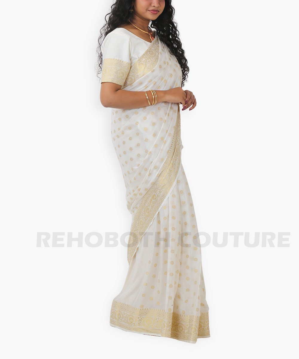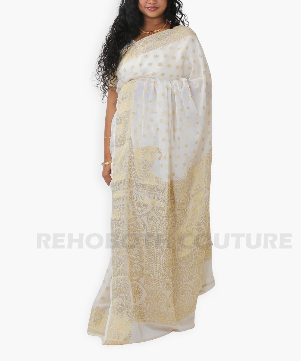 Half white georgette with golden paisley motifs.