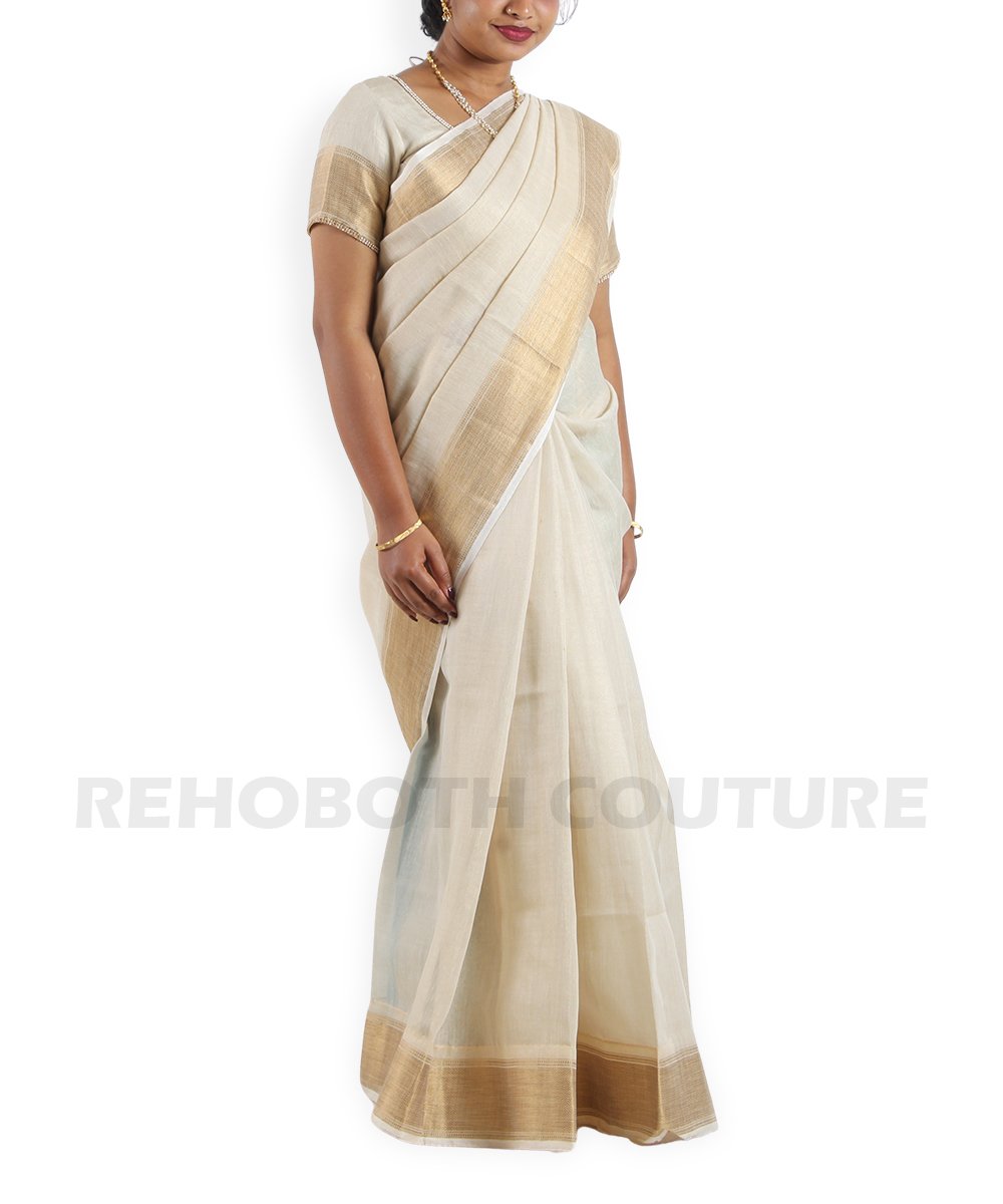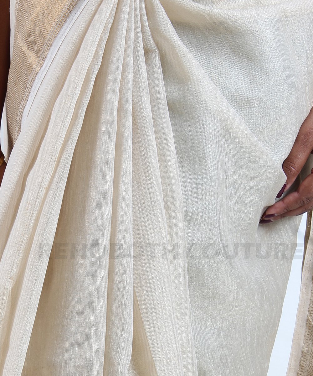 Elevate your ethnic wardrobe with this exquisite half white jute saree adorned with golden zari. The key feature is the intricate zari woven work on the border, while the pallu boasts light and dark golden thread weaving in a typical stripes pattern, imparting a subtle sheen to the fabric. Perfect for rentals on special occasions, offering lightweight elegance and traditional charm.