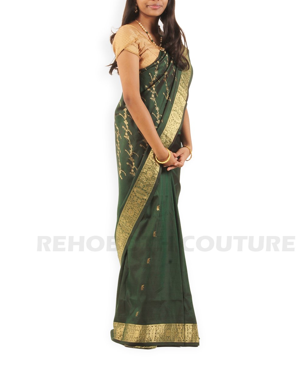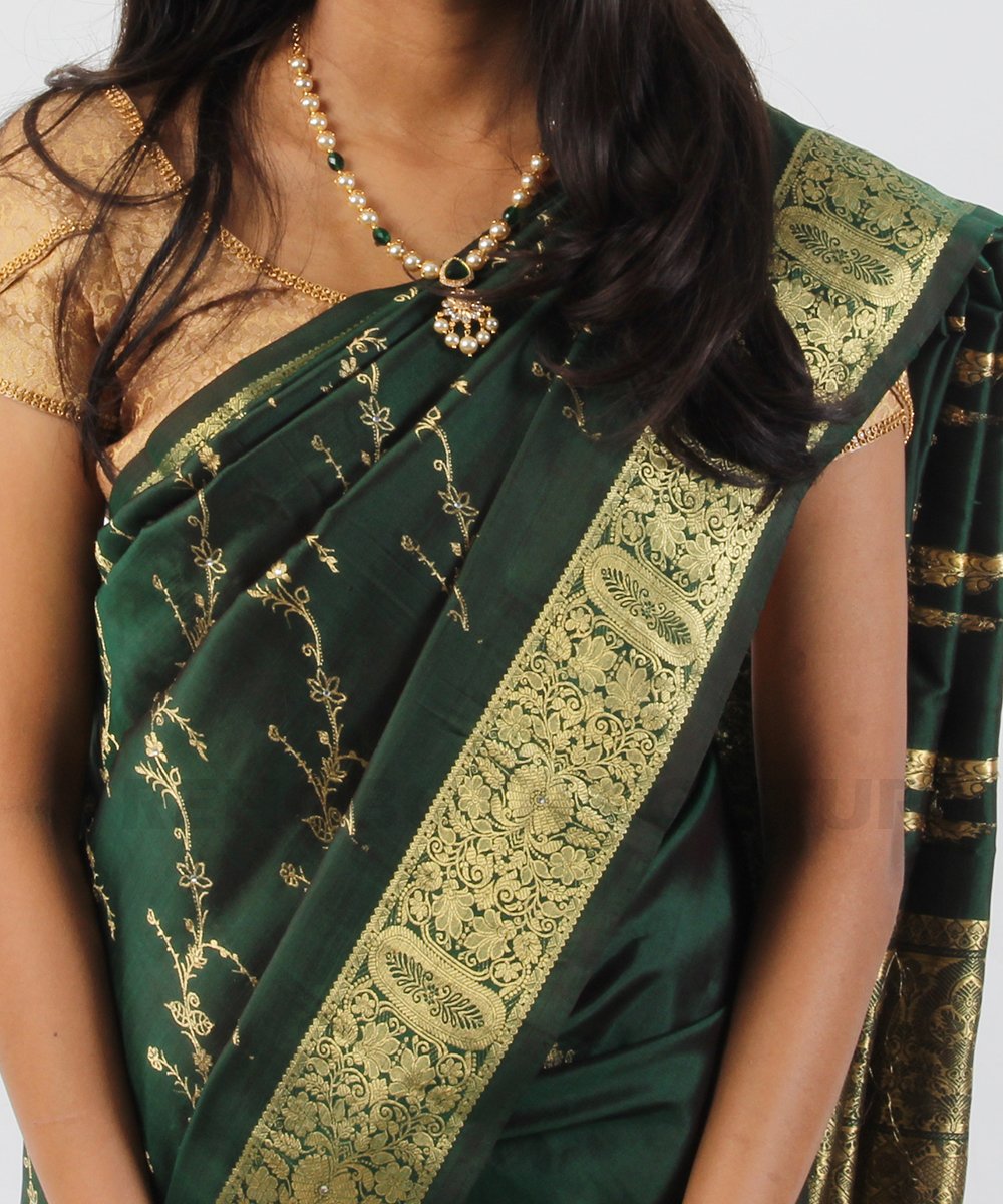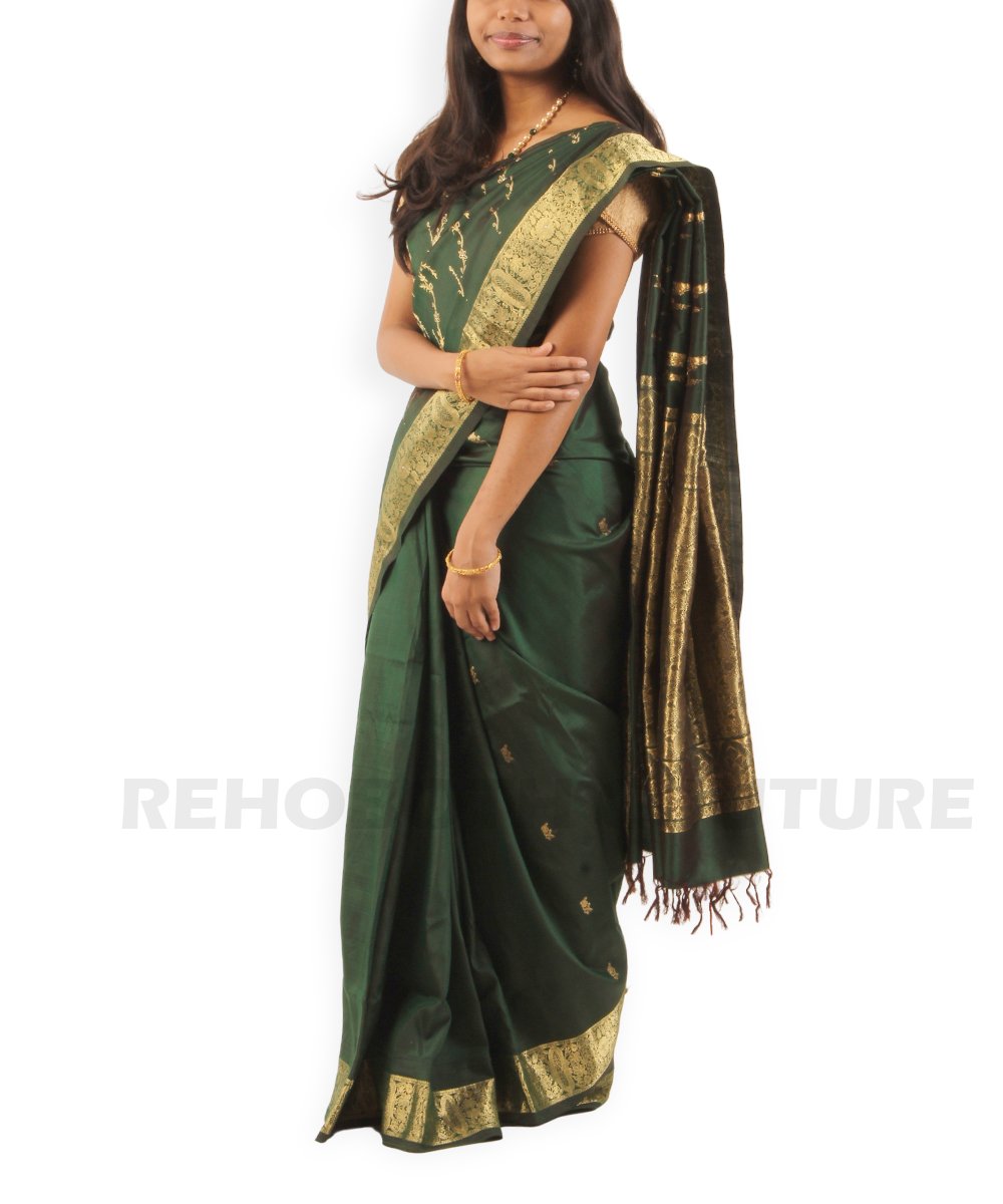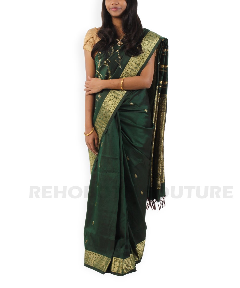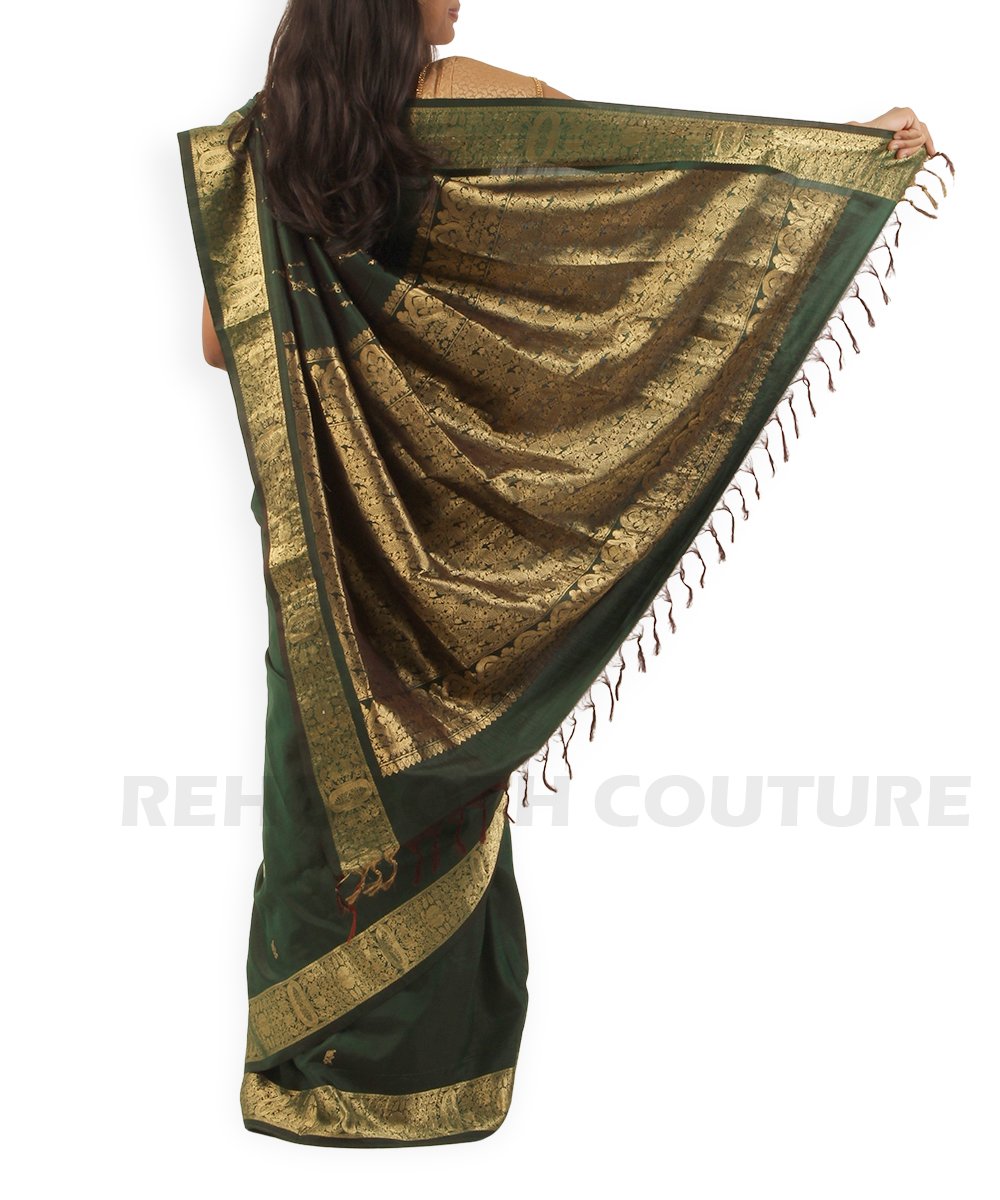 Rent this opulent Kanjivaram dark green pure silk saree, available on rent and return basis. Adorned with elaborate gold zari work all over the body, it exudes luxury and tradition. Ideal for grand celebrations, providing a rich sheen and comfortable wear.