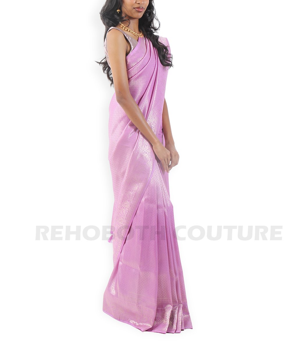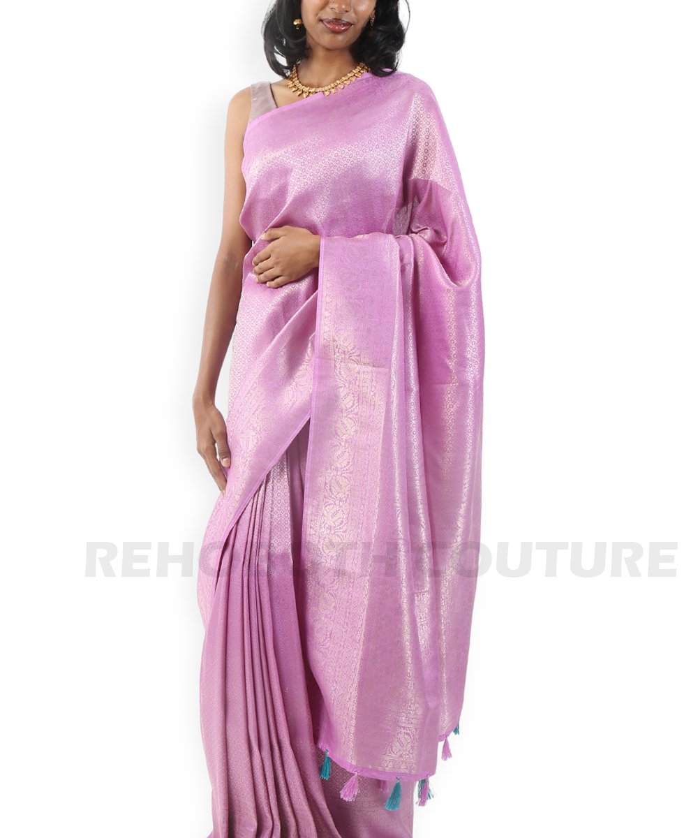 Rent this Katan silk Banarasi saree in lavender, available on rent and return basis. Soft texture with detailed brocade zari work provides firm drape and luxurious traditional designs for special occasions.