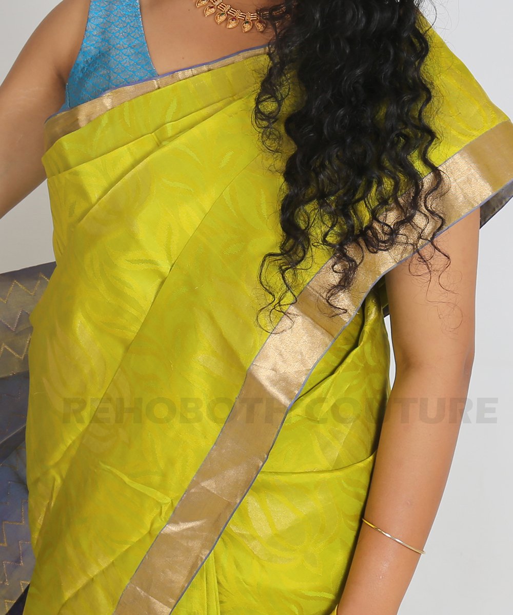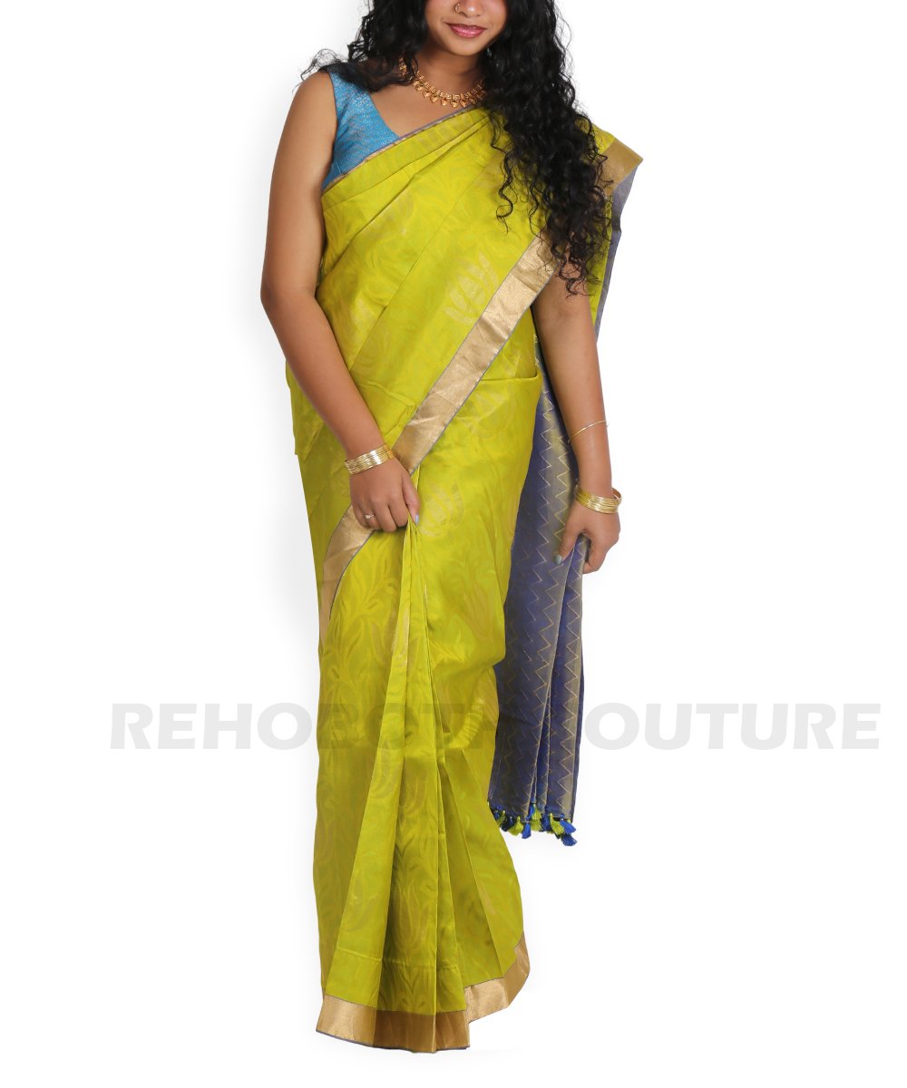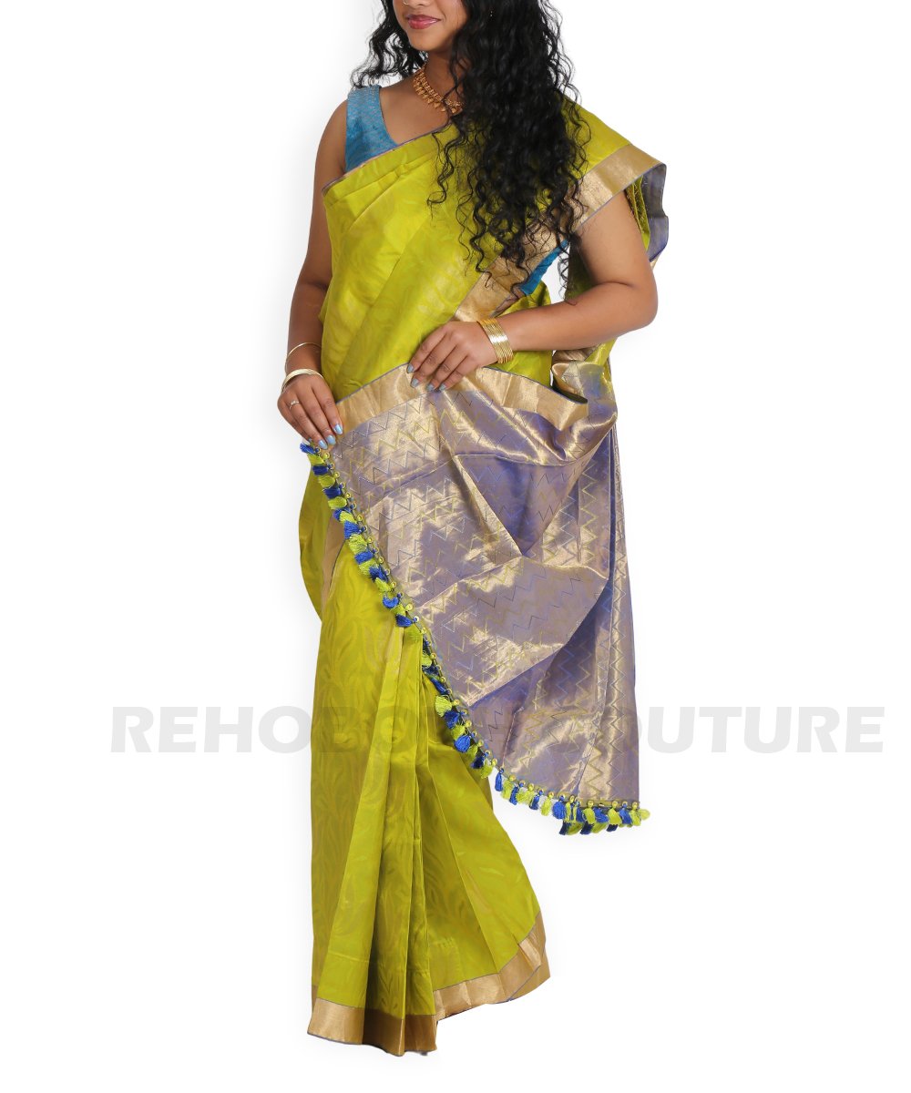 Rent this vibrant lime green chartreuse Kanchivaram silk saree with shimmery purple-blue pallu, available on rent and return basis. Gold detailing on the border and tassel-edged pallu add luxury. Perfect for festive grandeur.