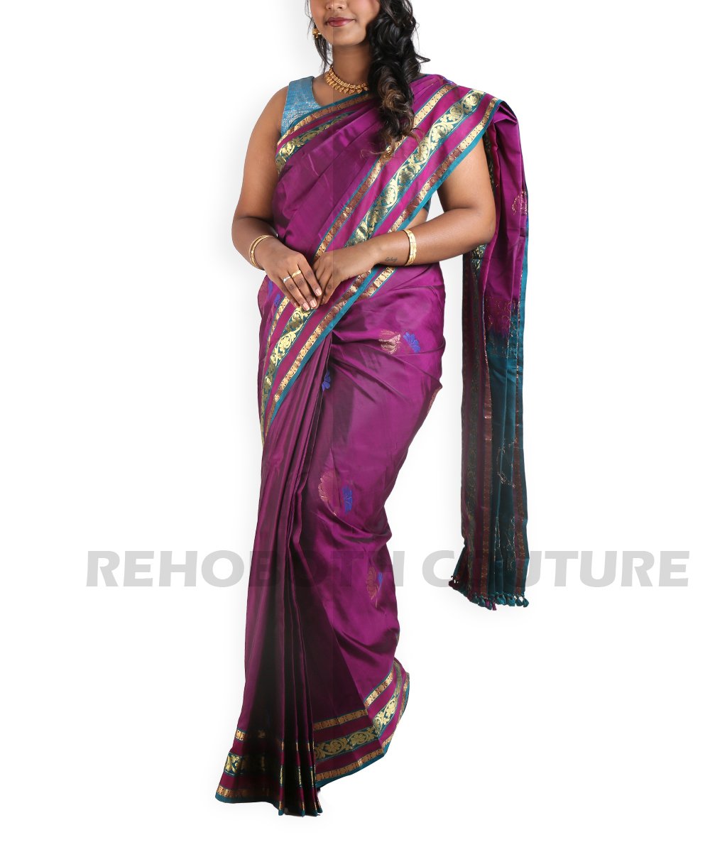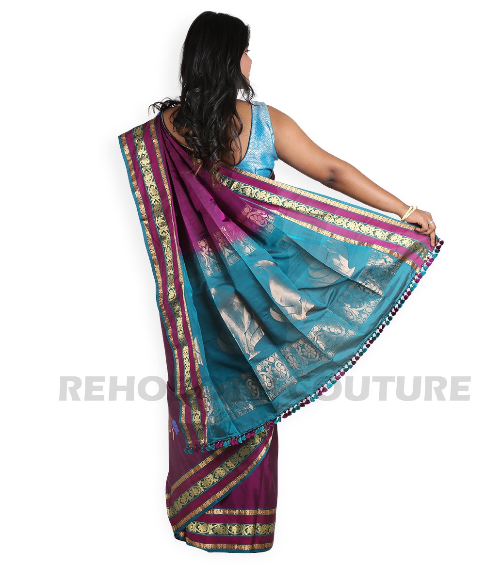 Rent this rich magenta-purple lightweight silk saree with broad gold zari border and blue accents, available on rent and return basis. Rare blue-gold motifs enhance its ornate appeal. Perfect for special functions.