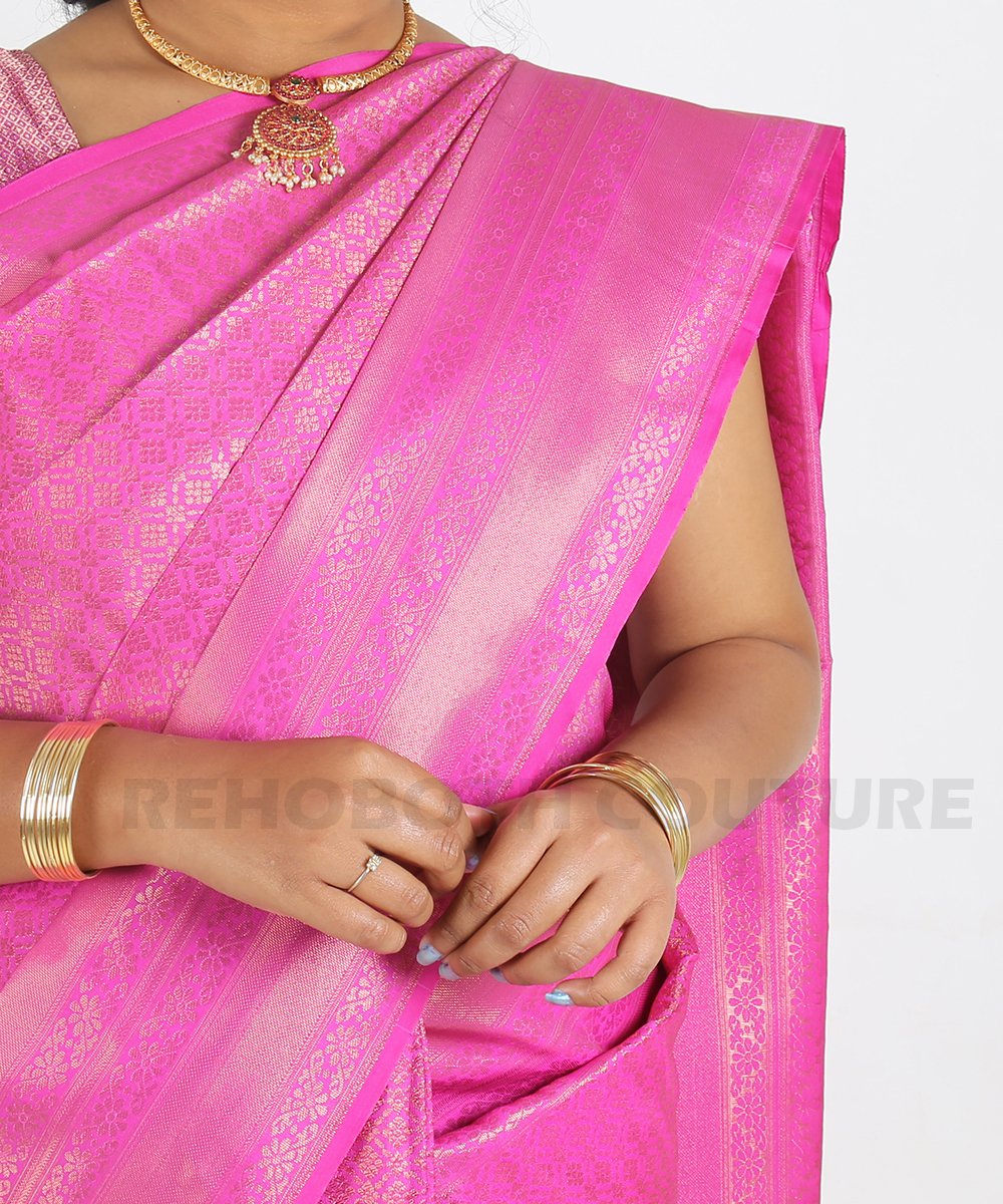 Rent this Banarasi silk saree in vibrant magenta-purple, available on rent and return basis. Elaborate golden zari creates intricate Mughal-inspired patterns throughout the body for a rich, graceful look. Perfect for weddings.