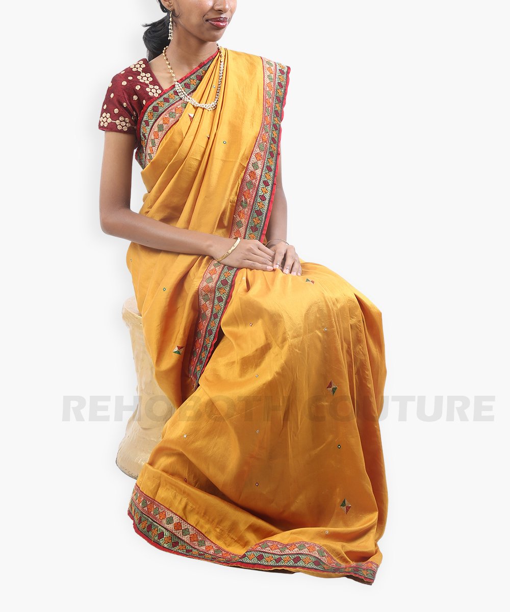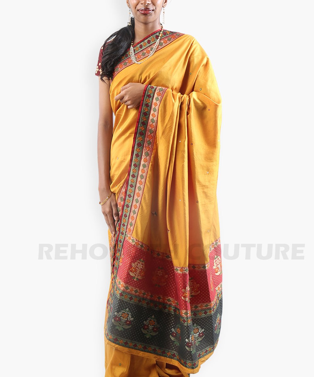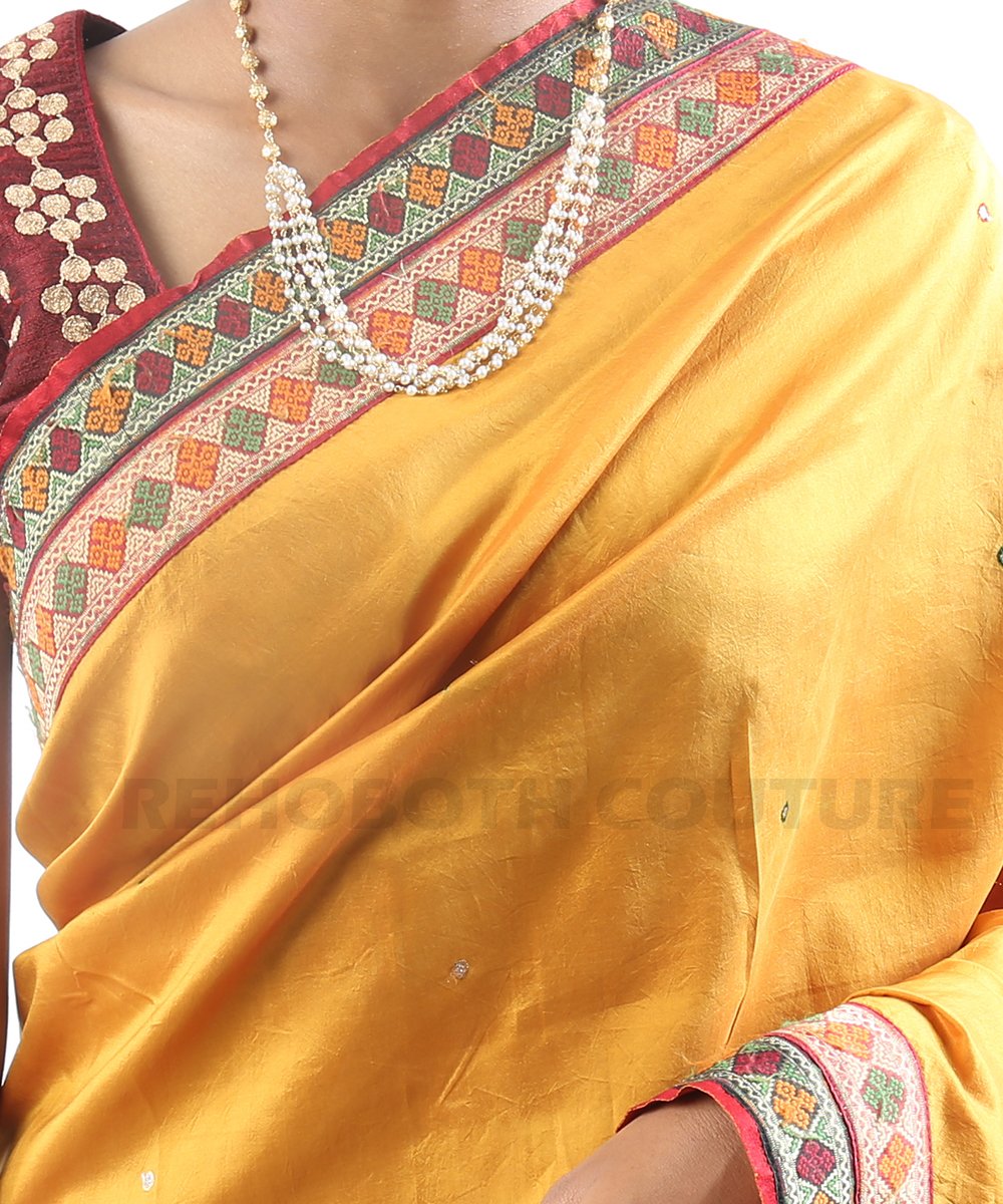 Rent this mustard yellow soft silk saree, available on rent and return basis. Bandhaj design highlights all over with finely crafted Kanchi zari border provide traditional opulence for festive wear.