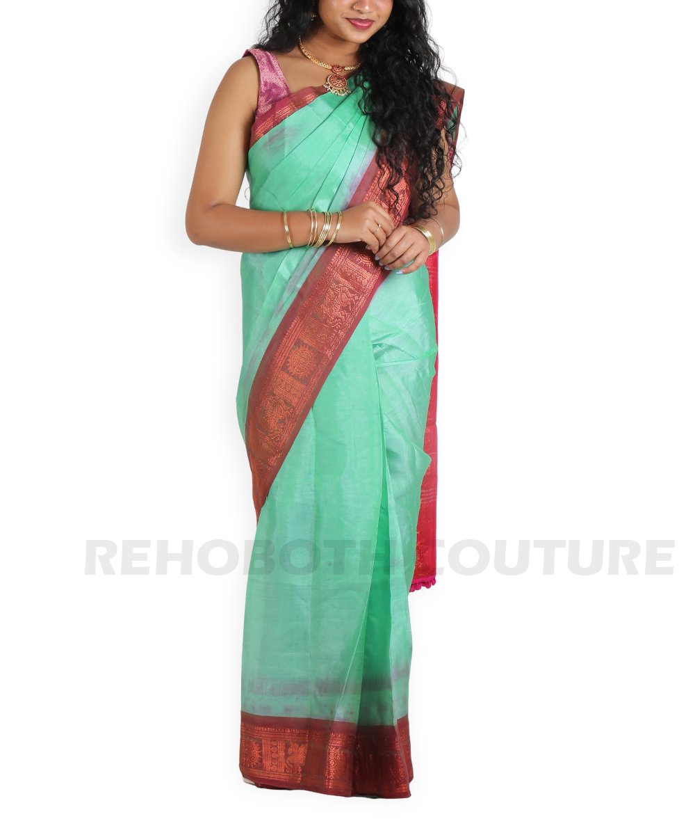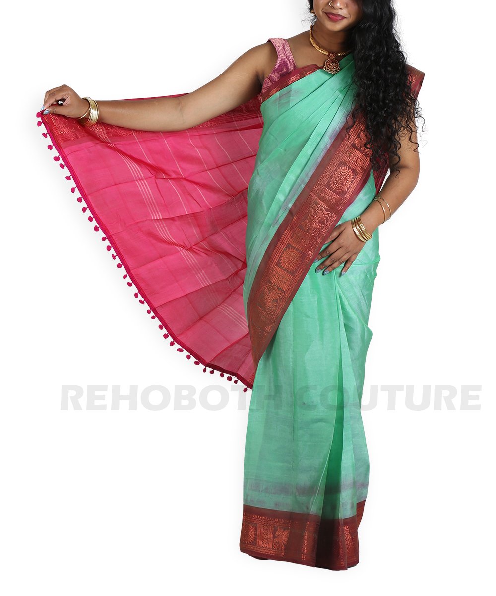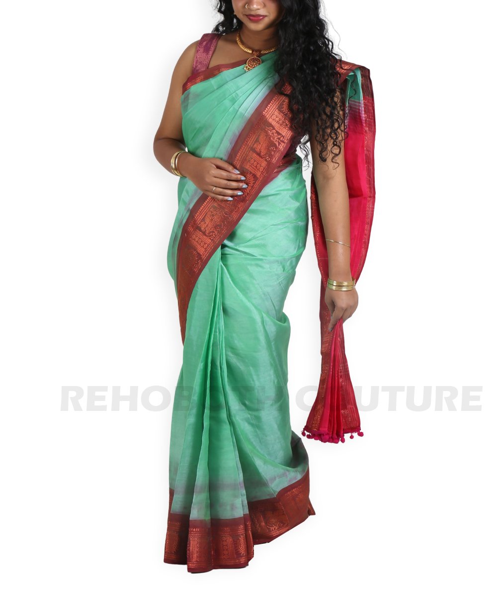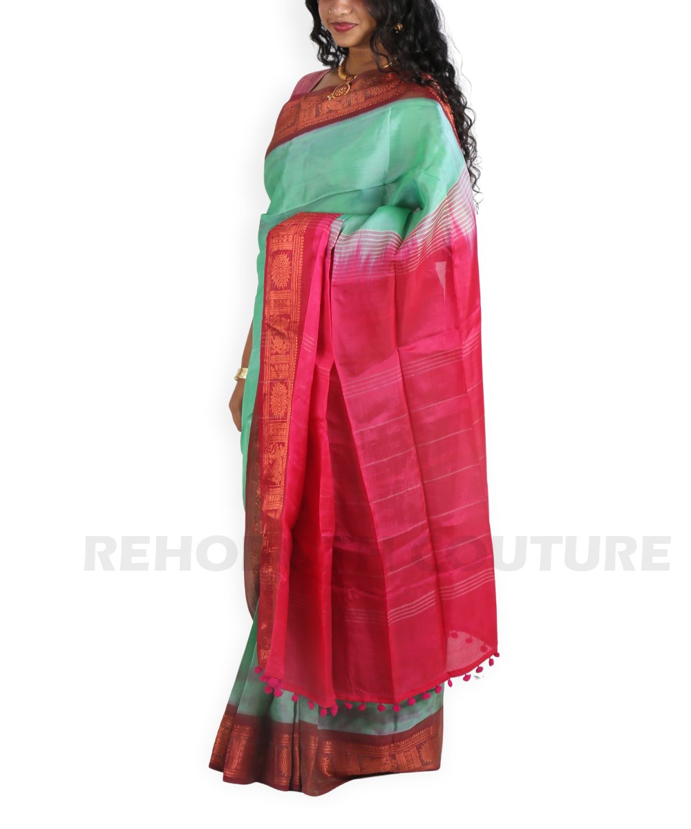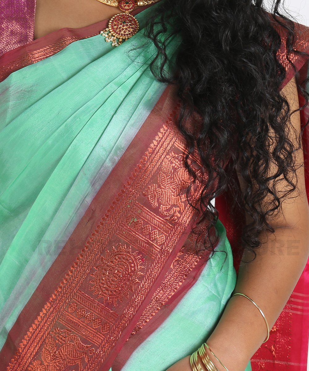 Rent this mulberry silk saree in deep peacock green with rani pink border and pallu, available on rent and return basis. Rich brocade zari work adds dramatic contrast and traditional elegance. Great for grand events.