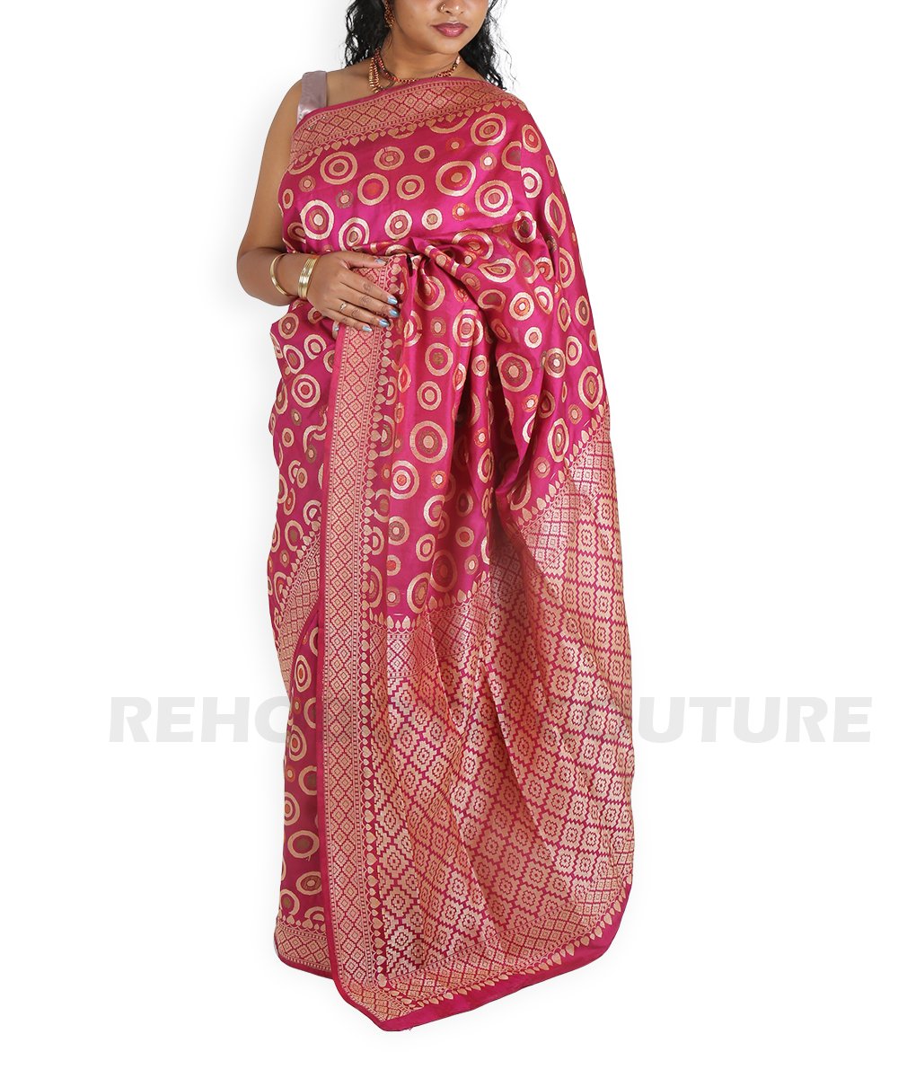 Pink Banarasi silk with floral motifs.
