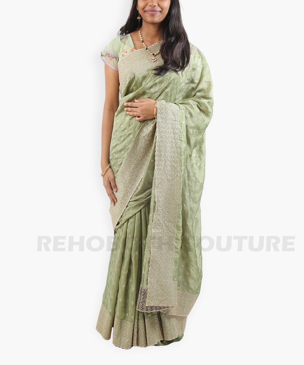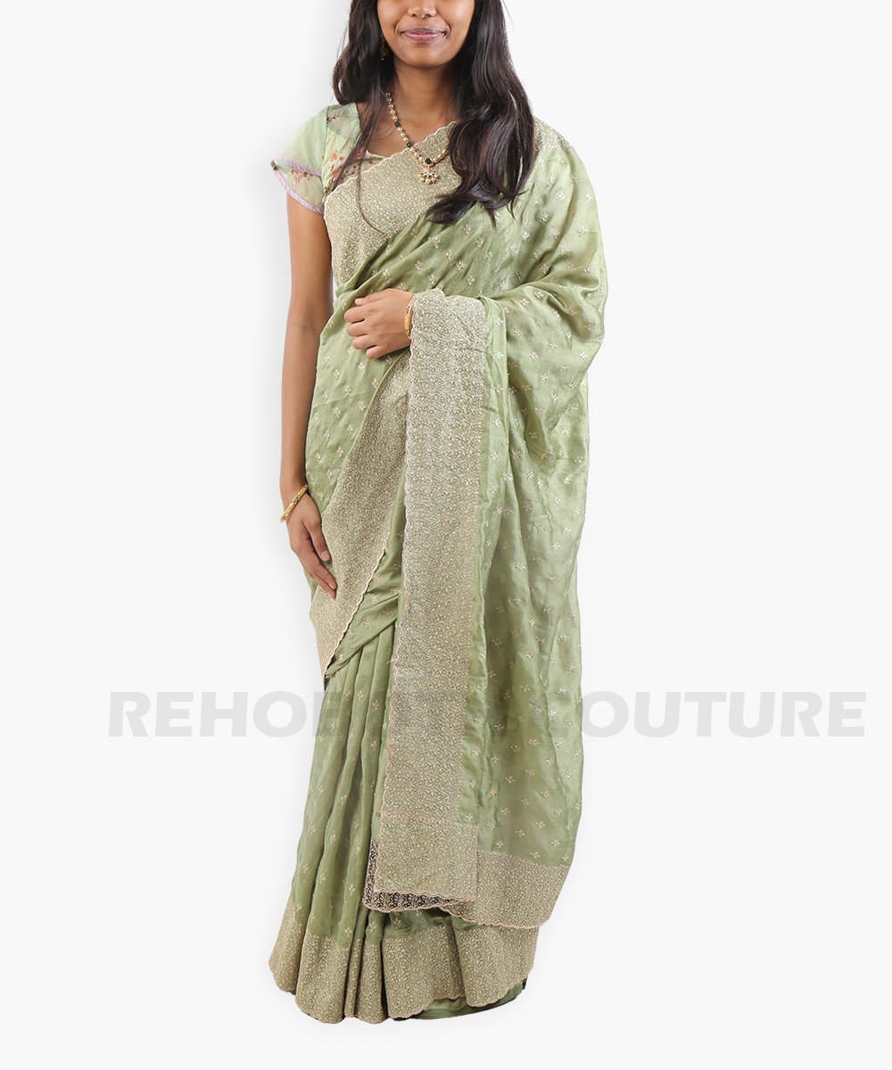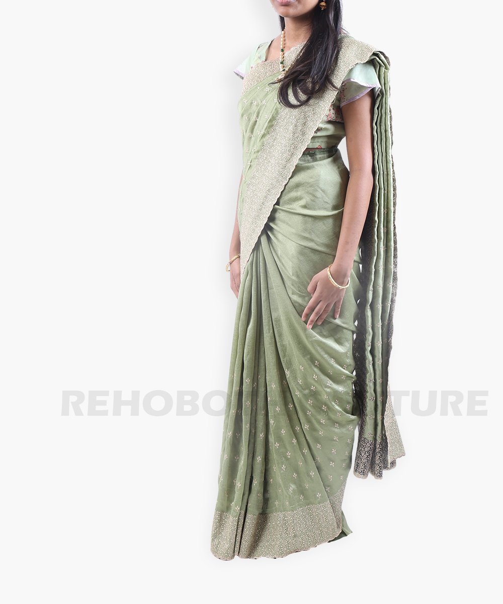 Rent this pista green chiffon blend saree, available on rent and return basis. Zari work on borders and small scattered motifs in body provide lightweight festive elegance.