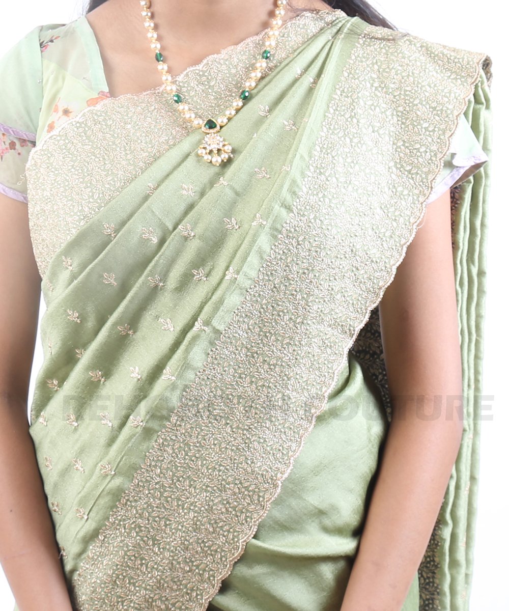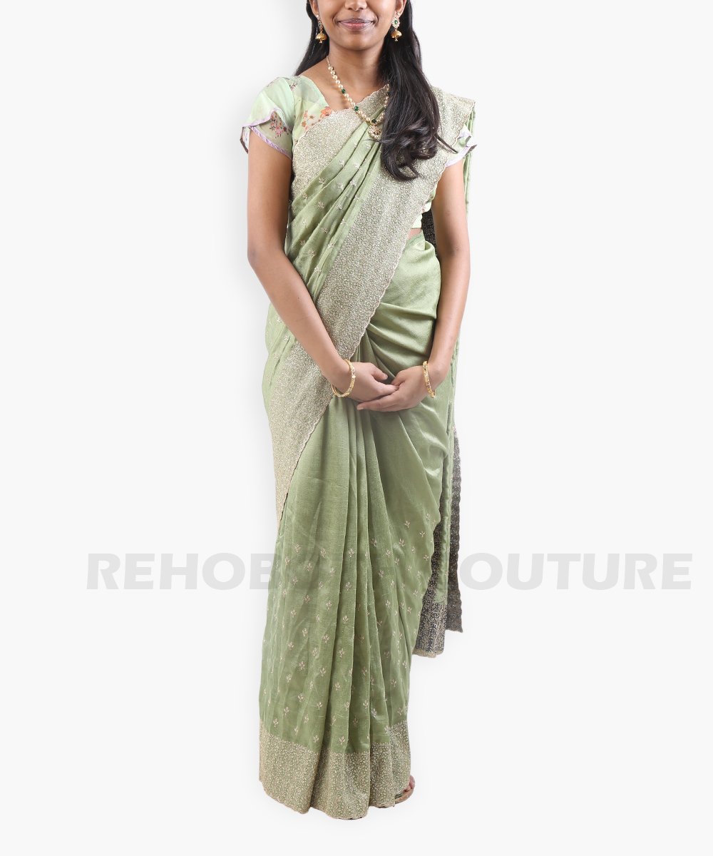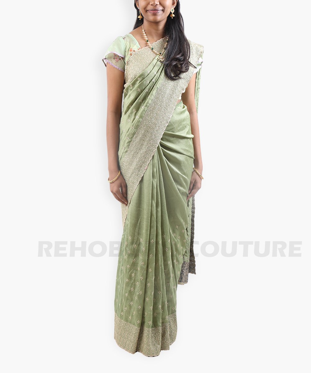 Rent this pista green chiffon blend saree, available on rent and return basis. Zari work on borders and small scattered motifs in body provide lightweight festive elegance.