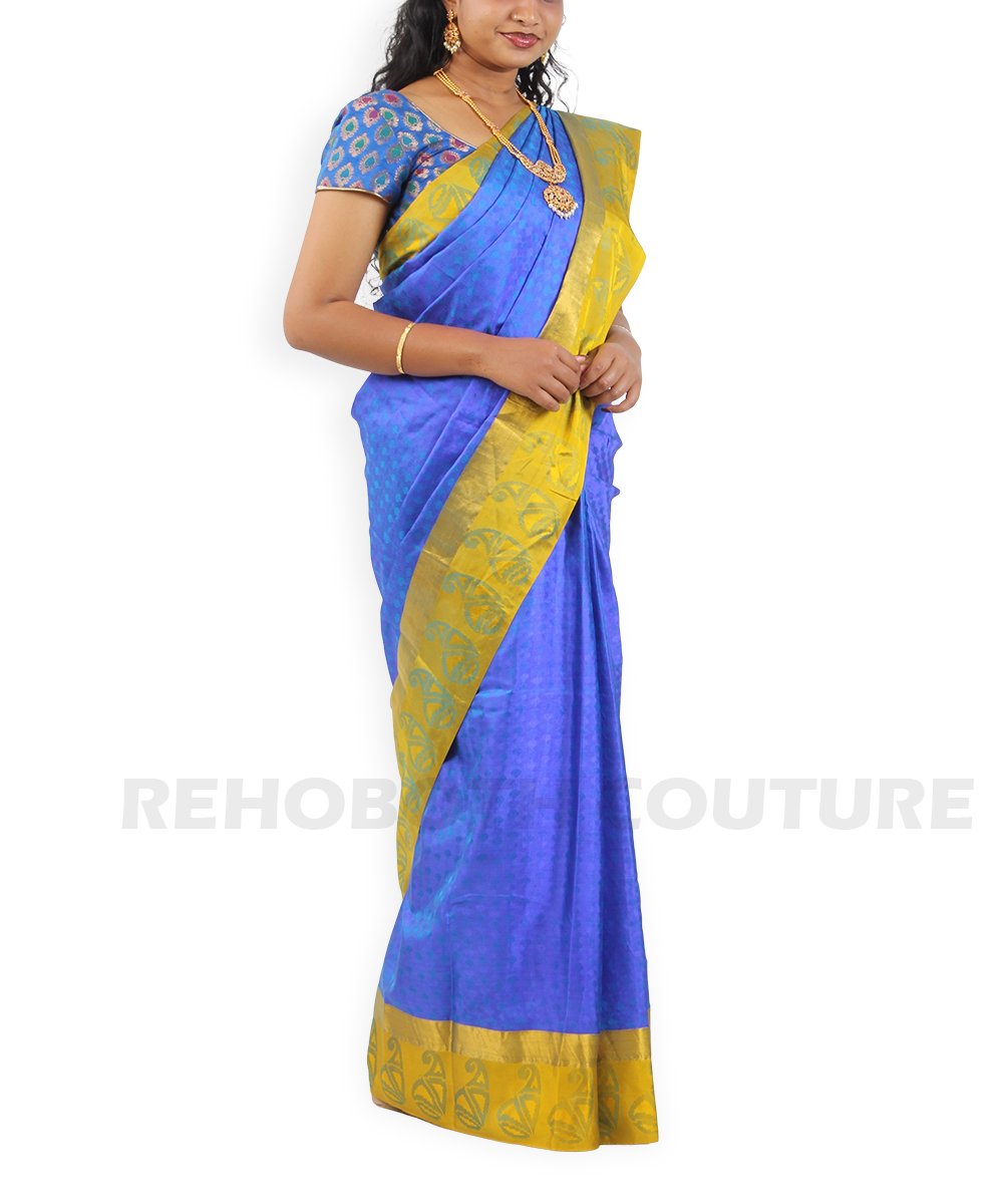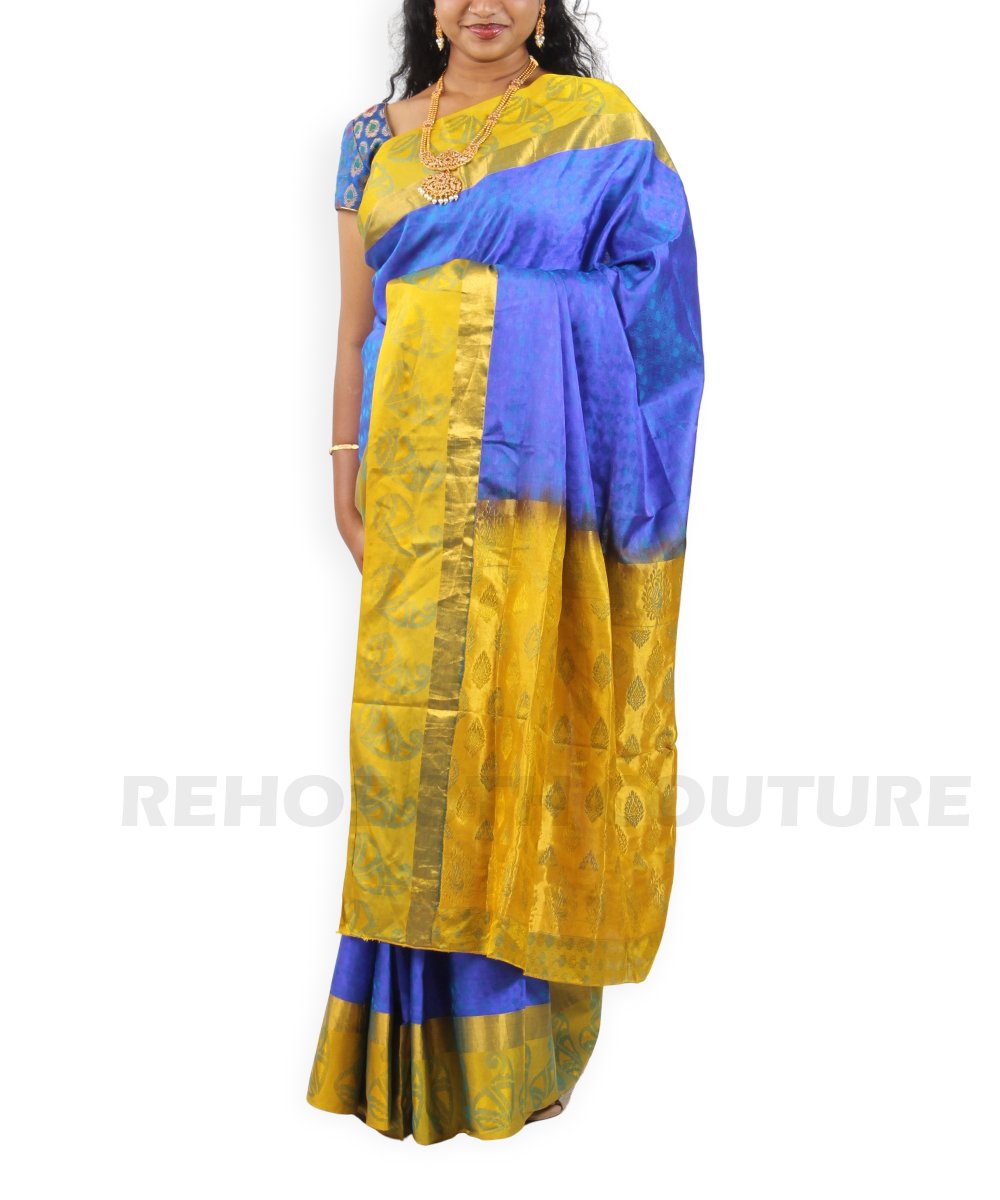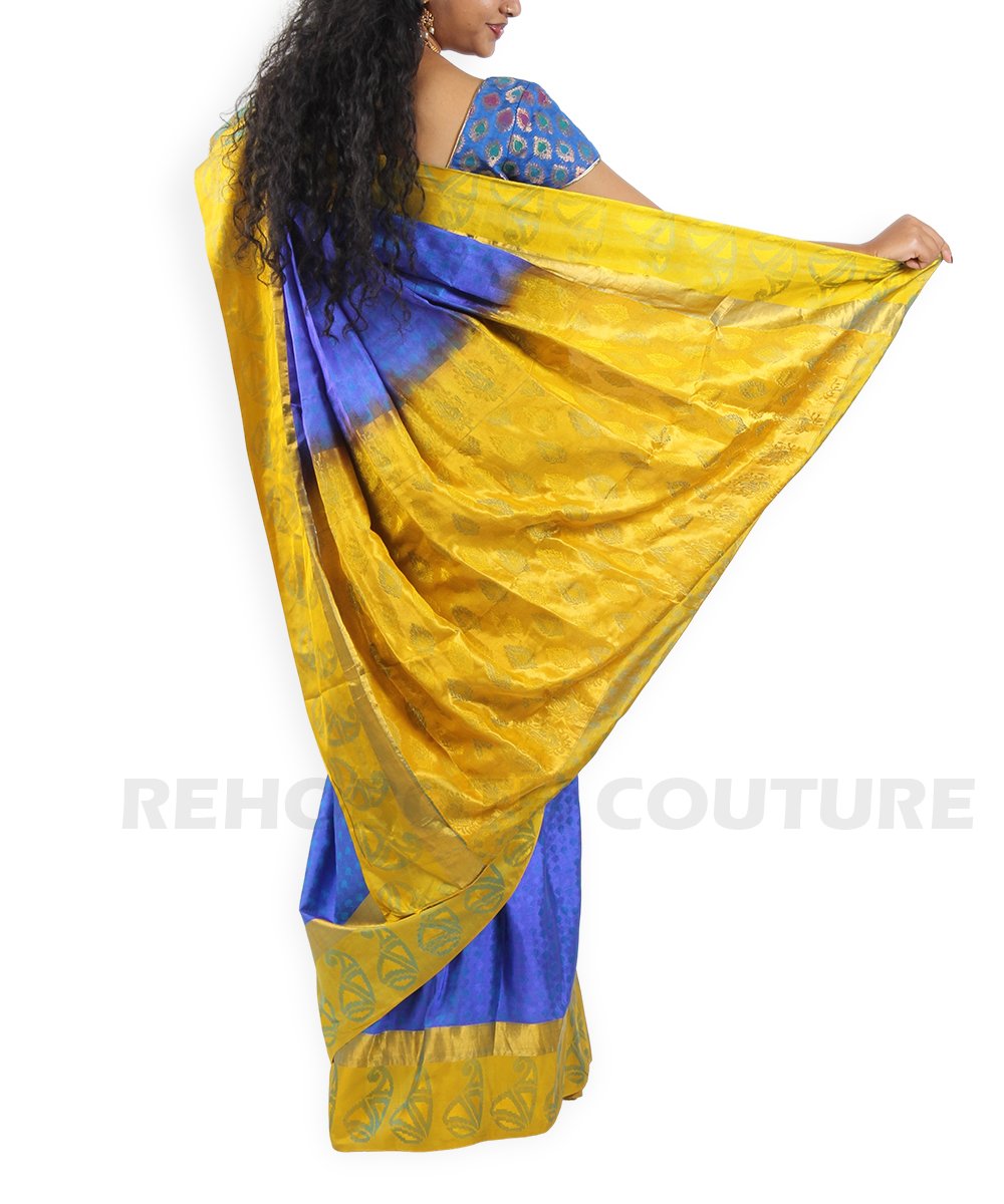 Rent this royal blue semi soft silk saree with mustard yellow accents, available on rent and return basis. Motifs all over the body add intricate charm and a luxurious feel. Suitable for elegant evening wear and special functions.