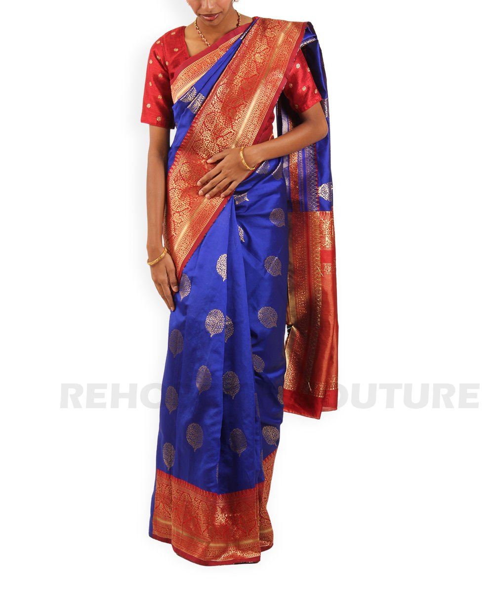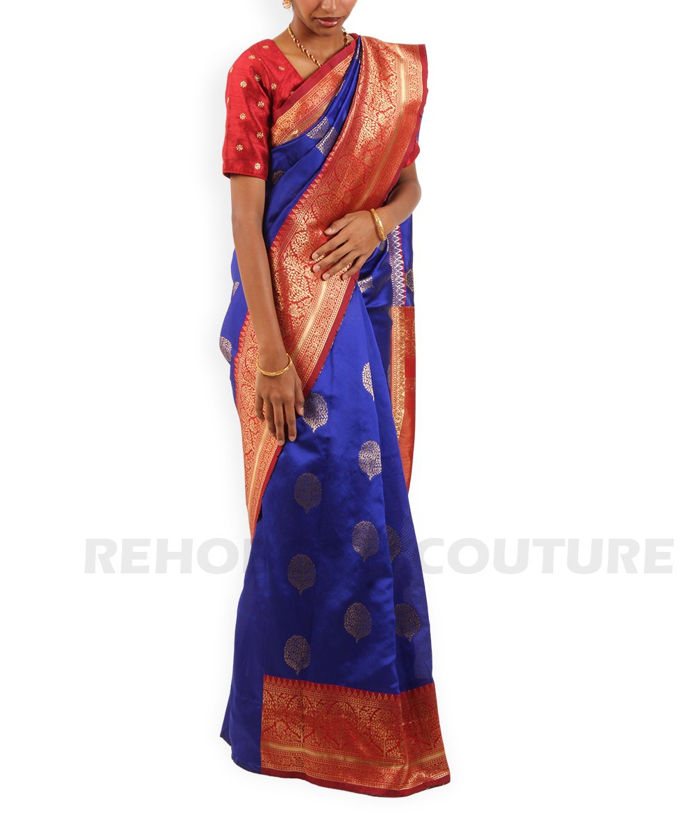 Rent this royal blue semi Banarasi saree with red golden border and pallu, available on rent and return basis. Elaborate leaf motifs woven in golden zari add traditional richness for festive occasions.