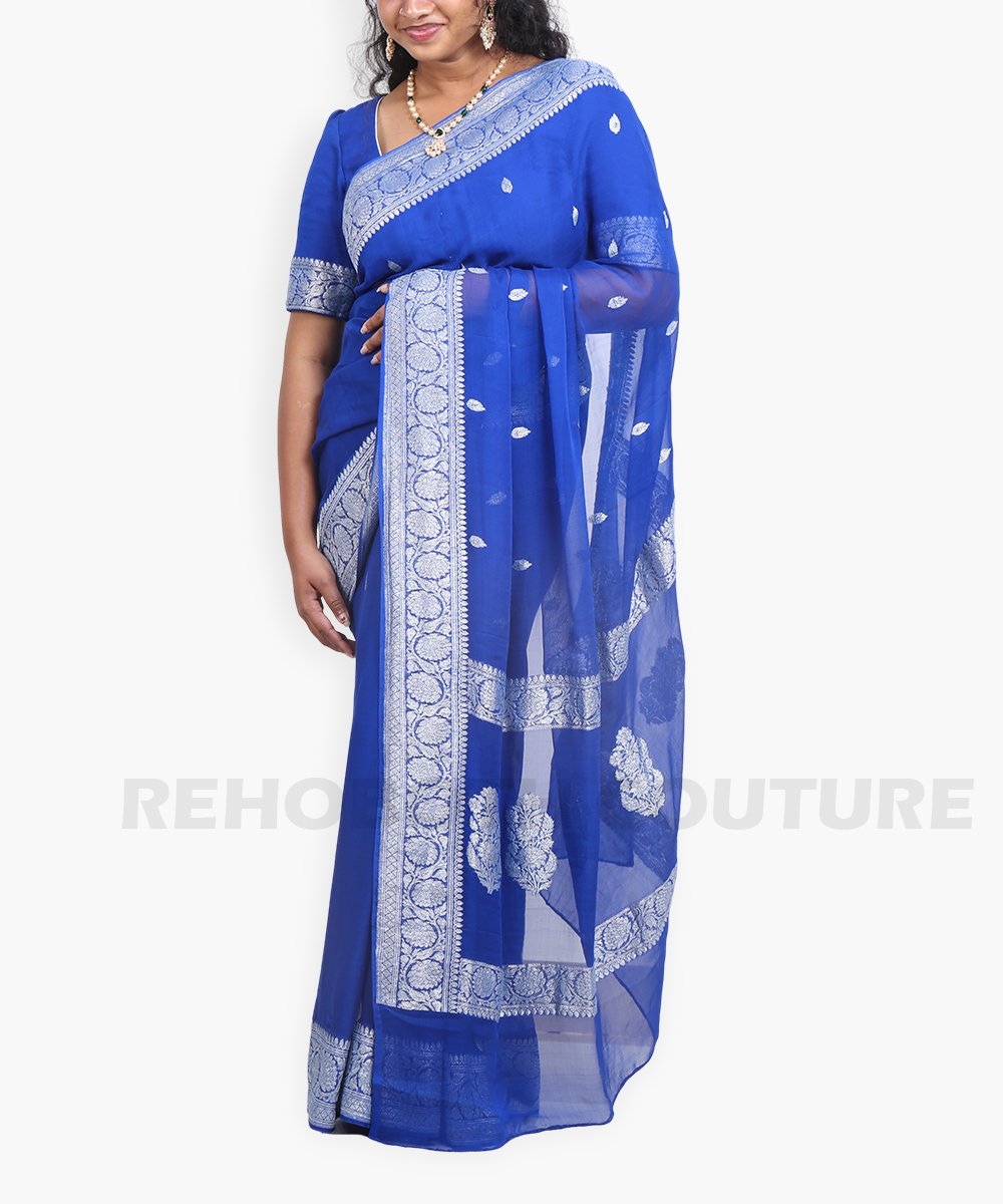 Royal blue Khadi Banarasi with silver motifs.