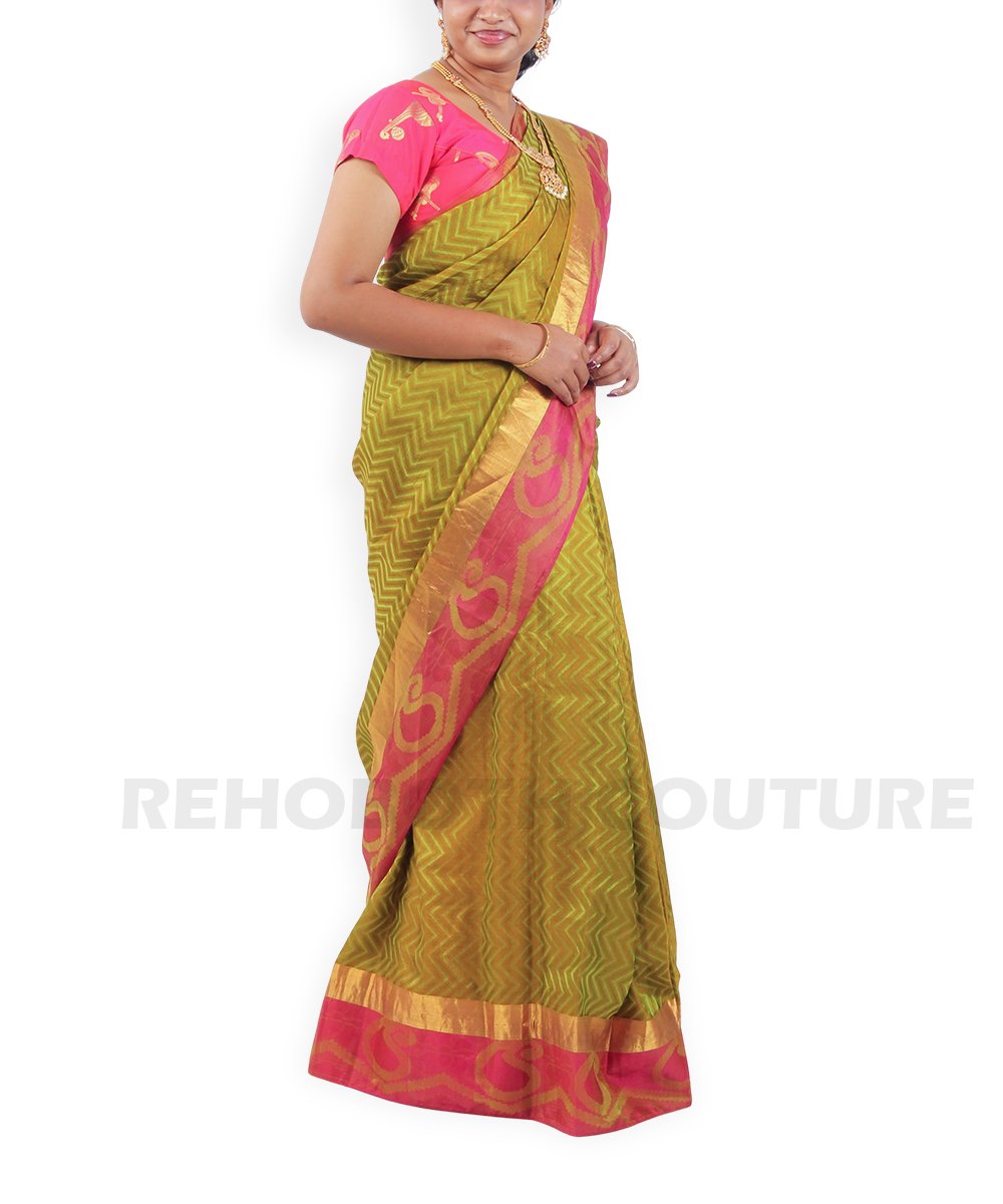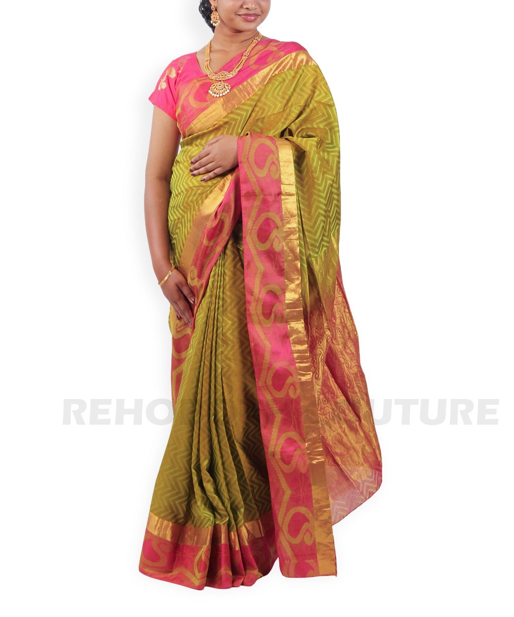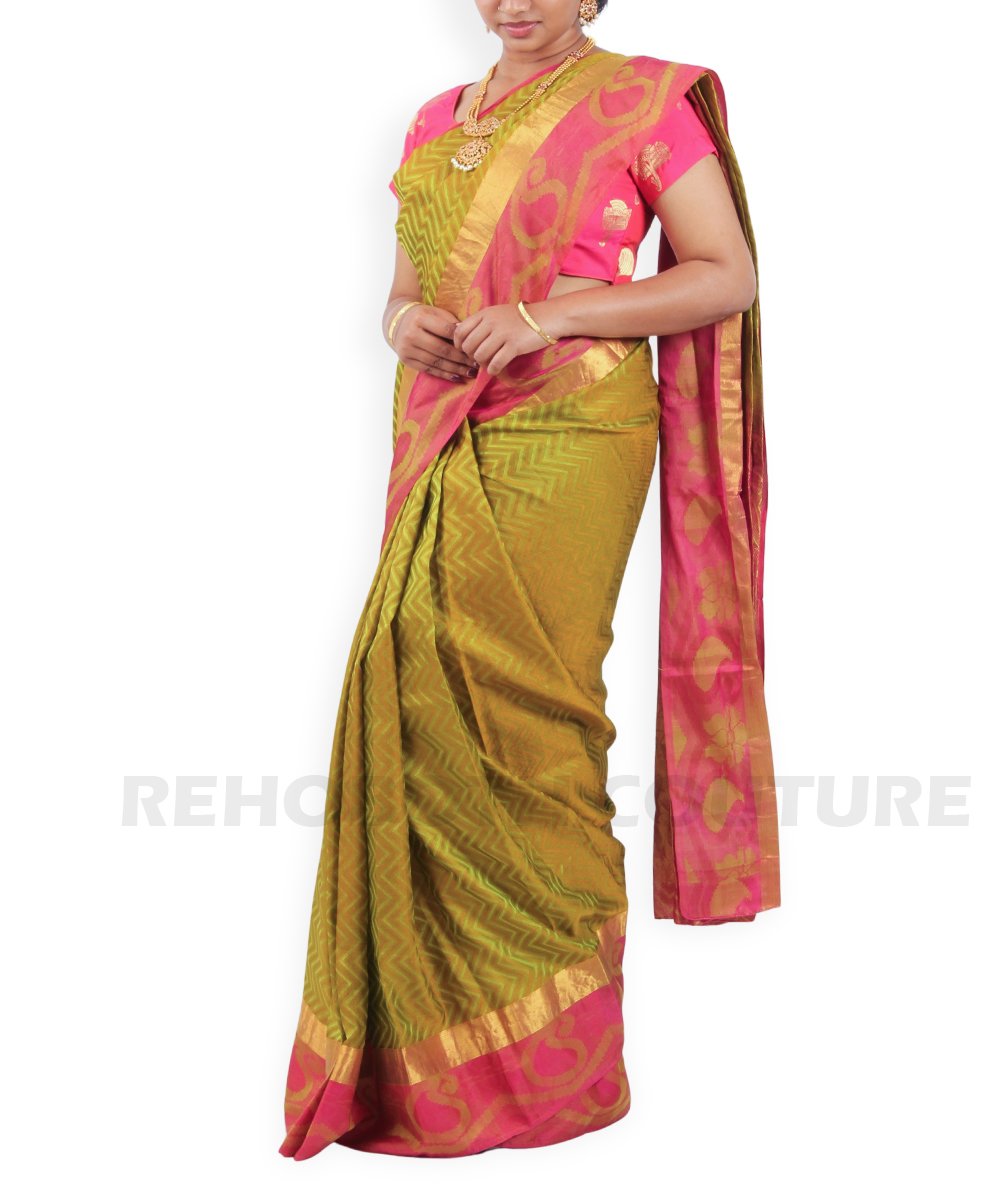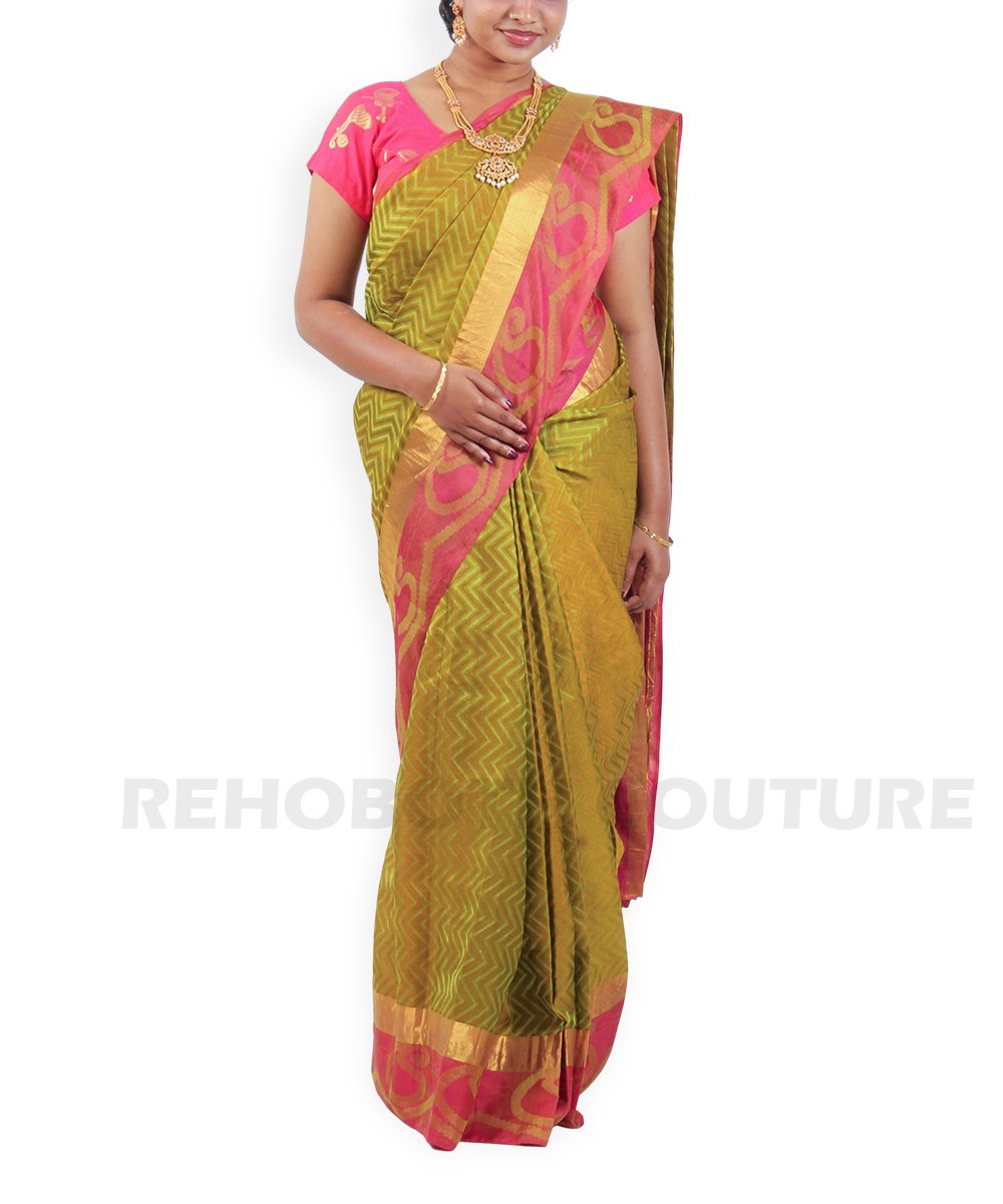Rent this silk blend jacquard saree, available on rent and return basis. Durable fabric with Kanjivaram or Banarasi-style craftsmanship provides gorgeous traditional elegance for weddings and festivals.
