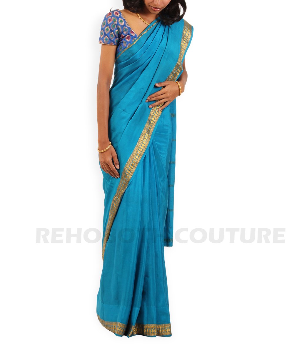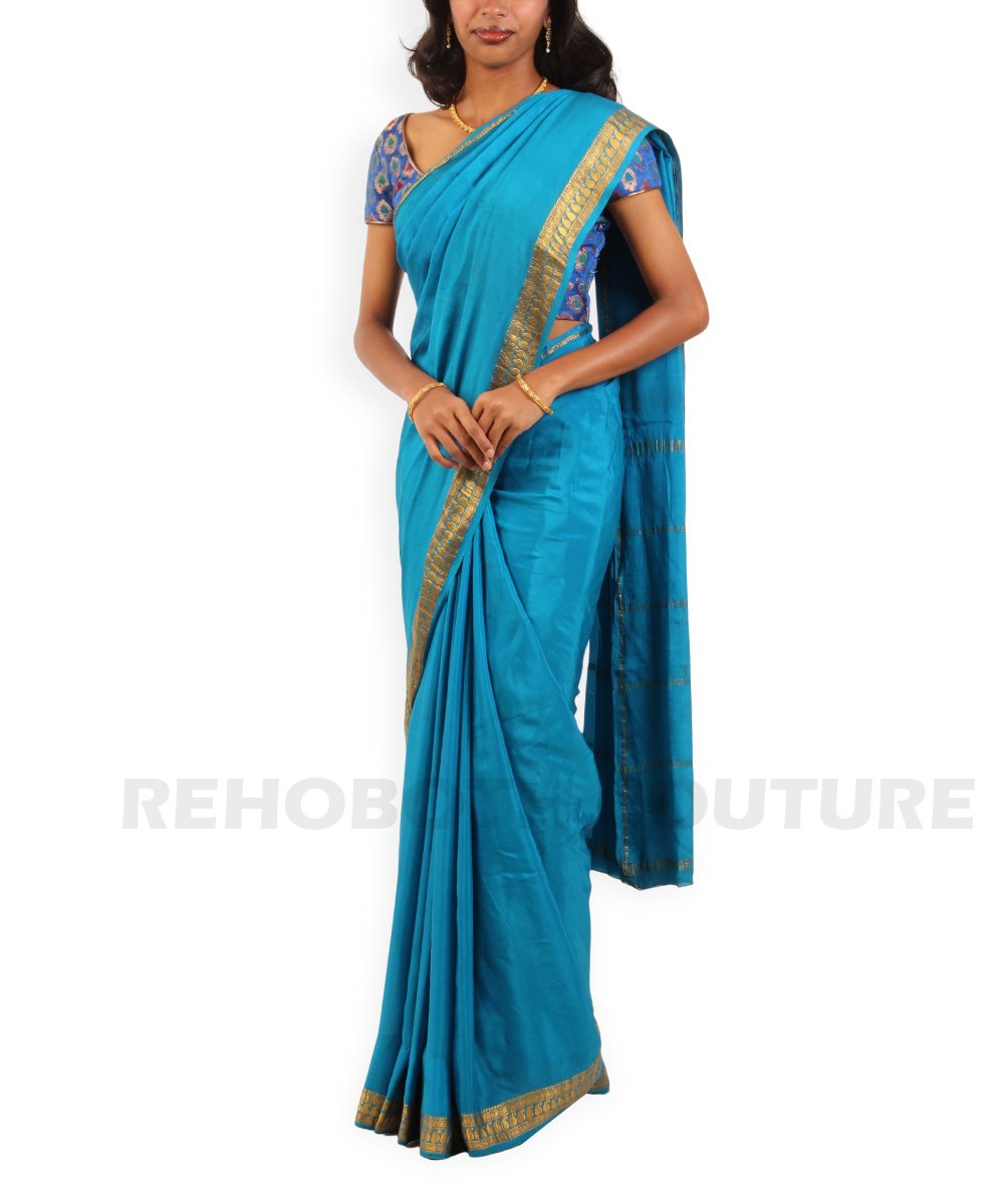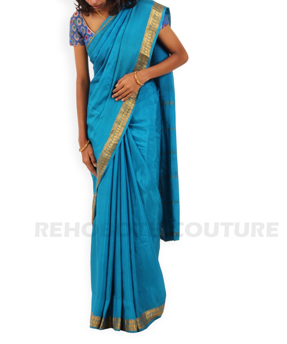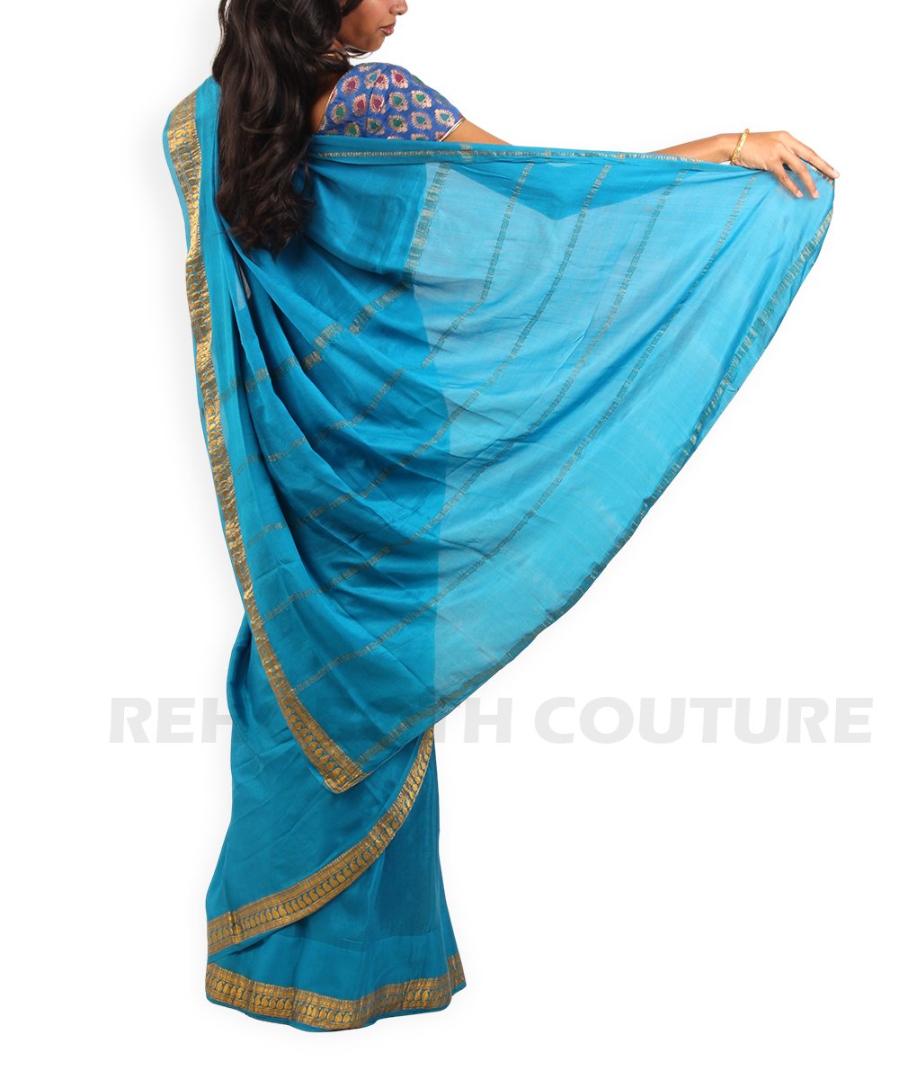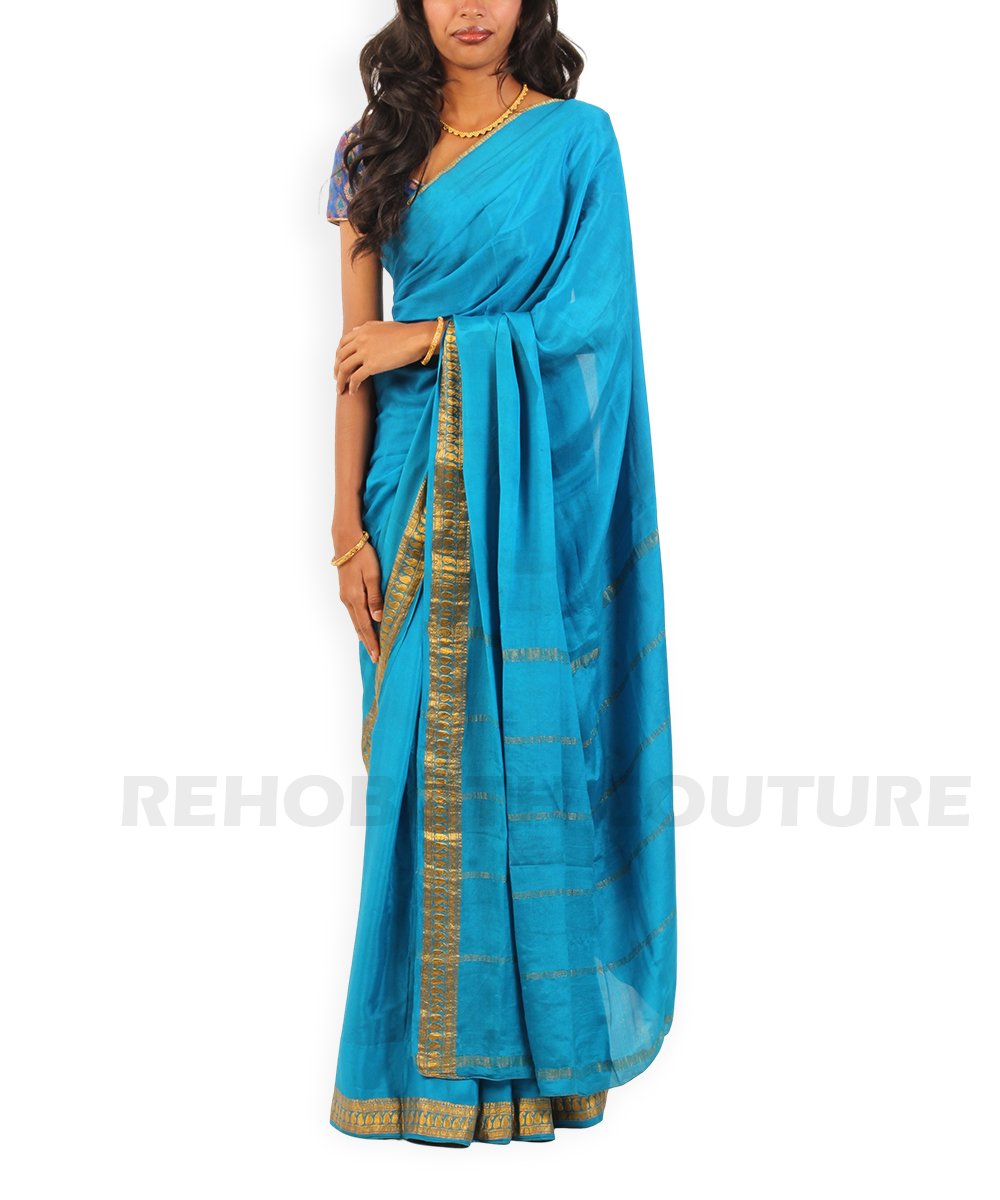 Rent this vibrant sky blue pure Mysore silk saree, available on rent and return basis. Gold thread woven mango motifs on border offer classic luxury drape.