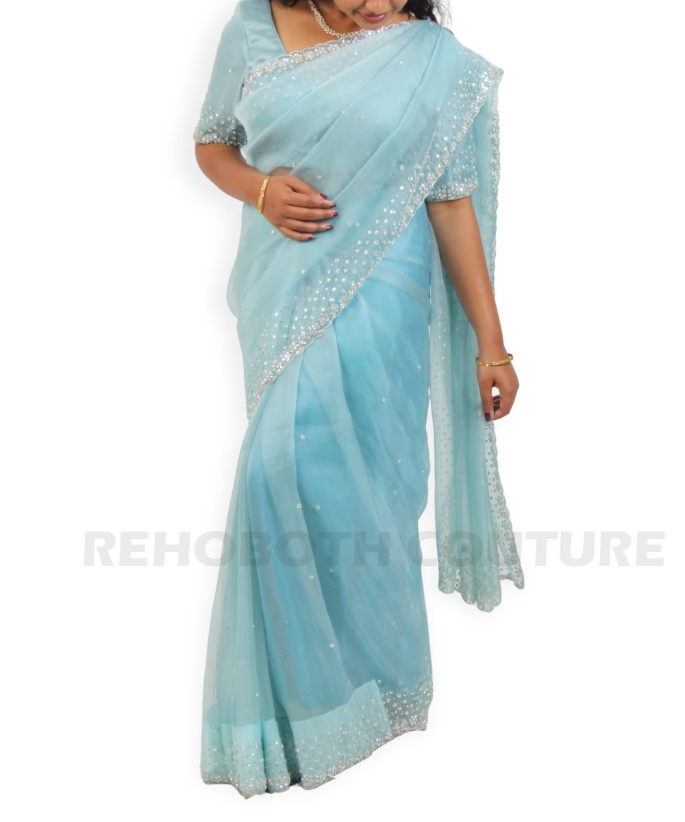 Sky blue organza designer saree with embellishments.