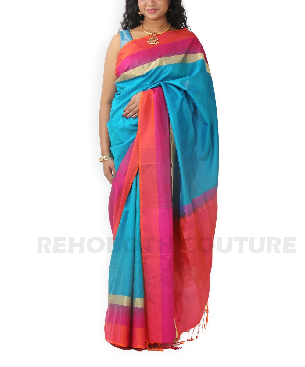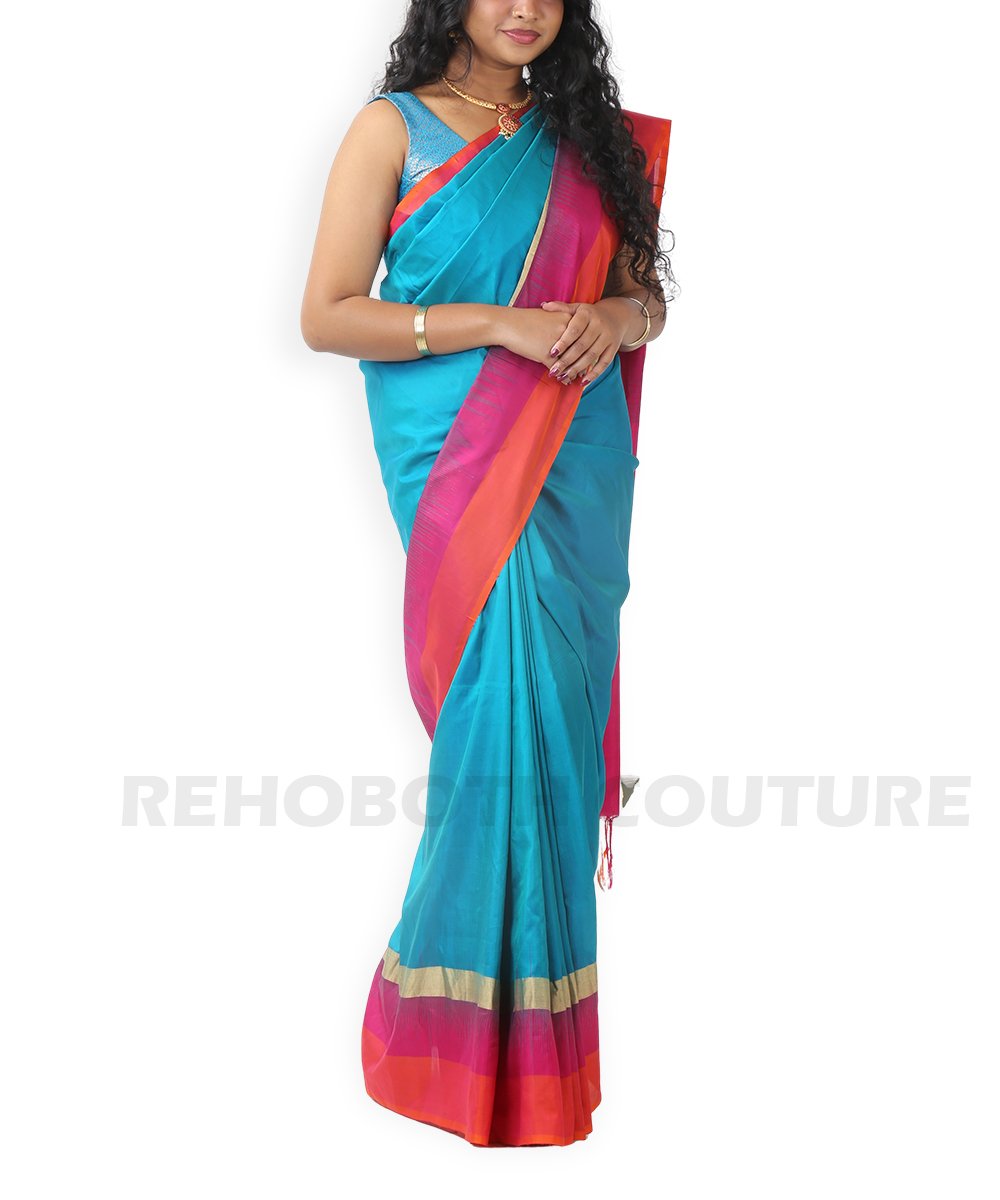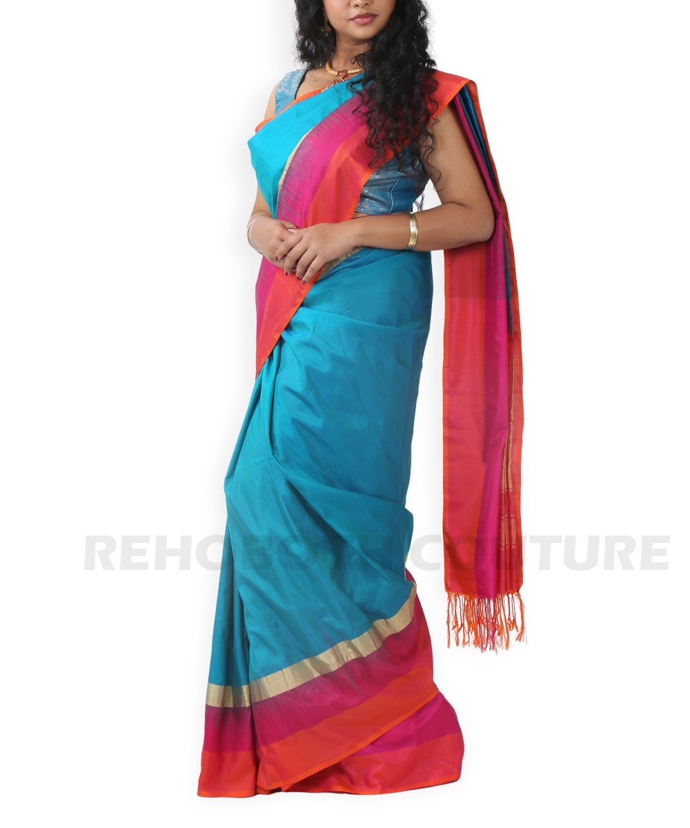 Rent this teal blue soft silk saree with contrasting pink-orange-gold border-pallu, available on rent and return basis. Thin stripes and zari accents create traditional richness.