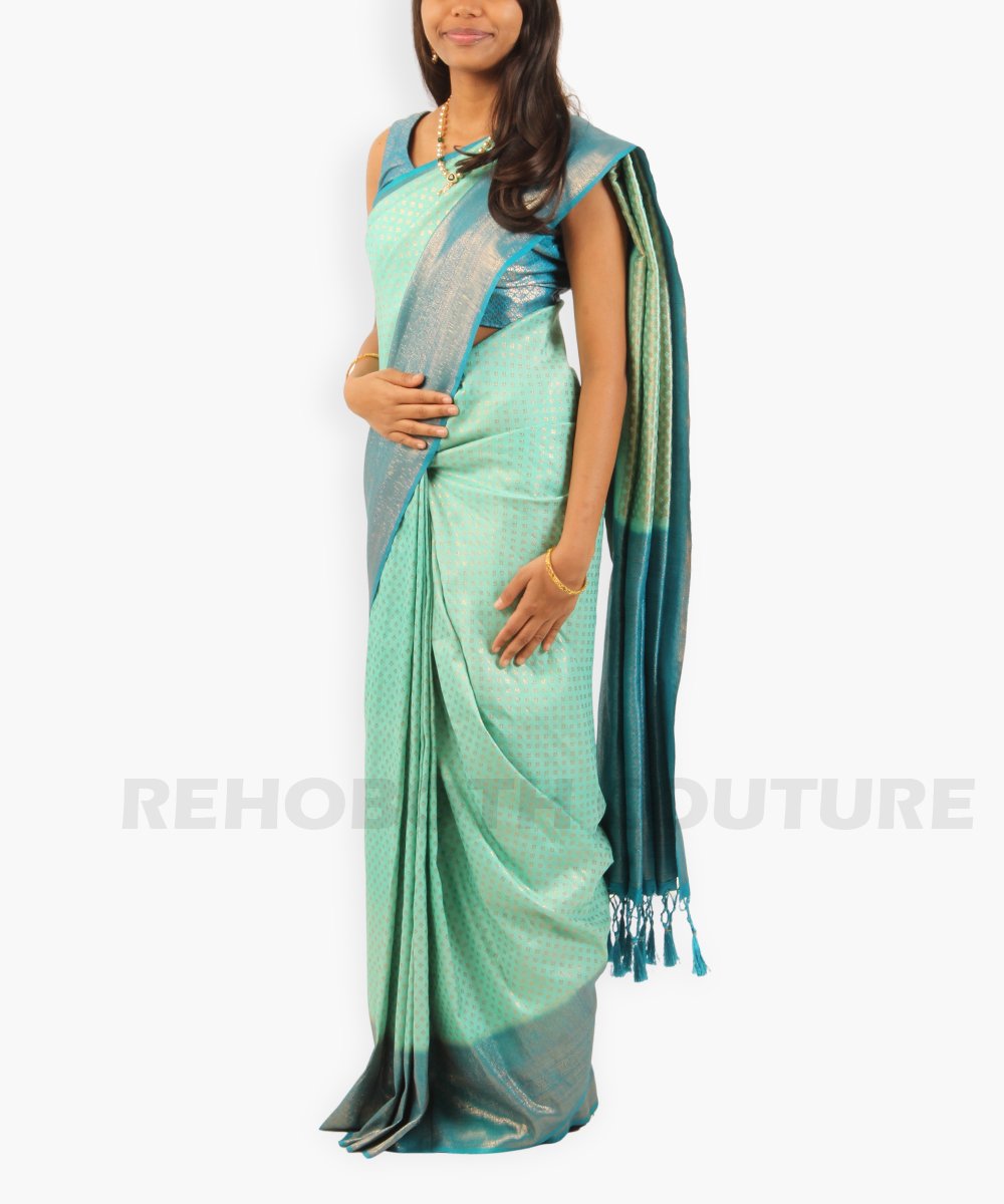 Turquoise green Banarasi with blue-gold border.