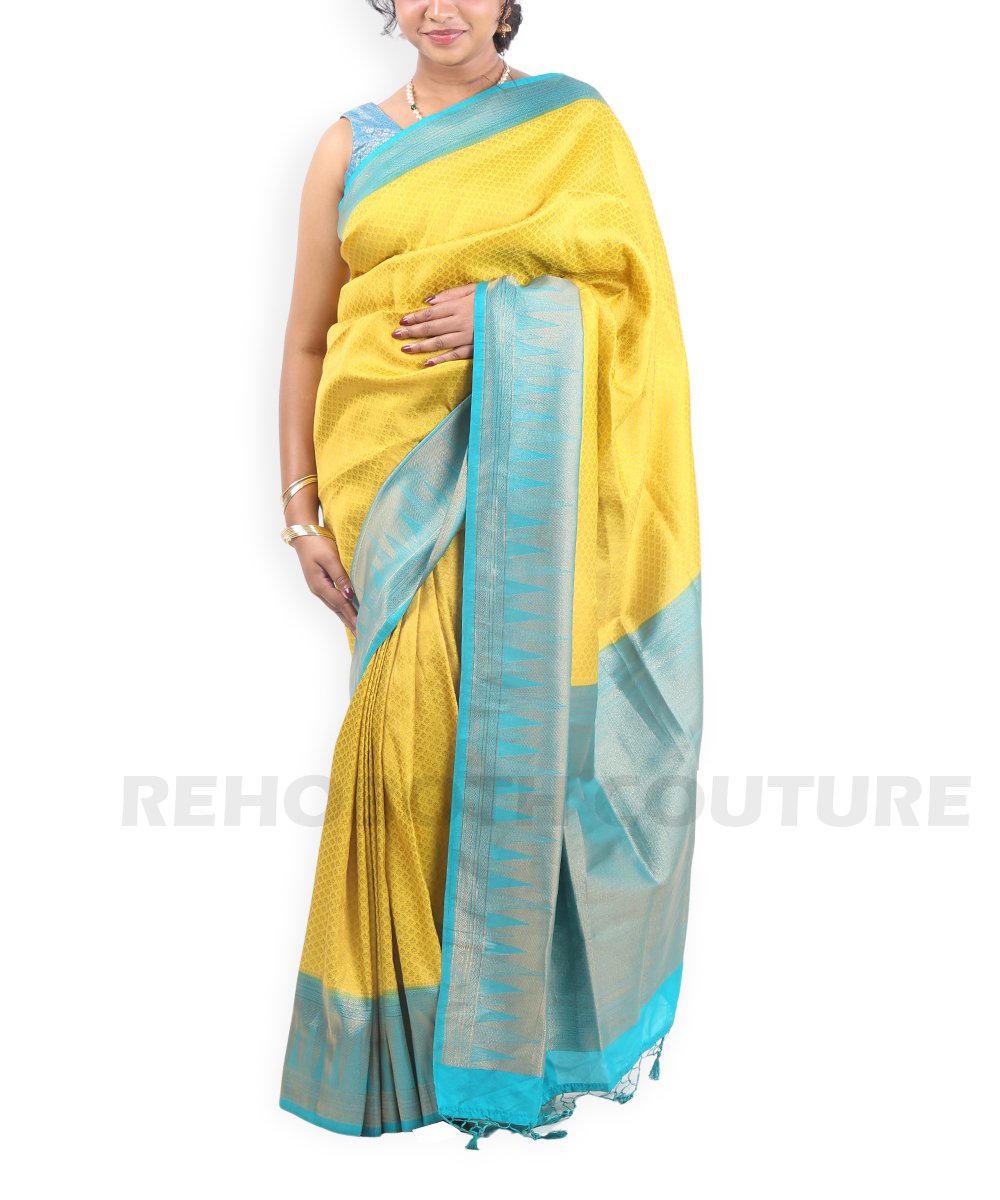 Rent this yellow and blue Banarasi saree, available on rent and return basis. Intricate zari buti and big-small temple patterns on border create mesmerizing traditional allure.